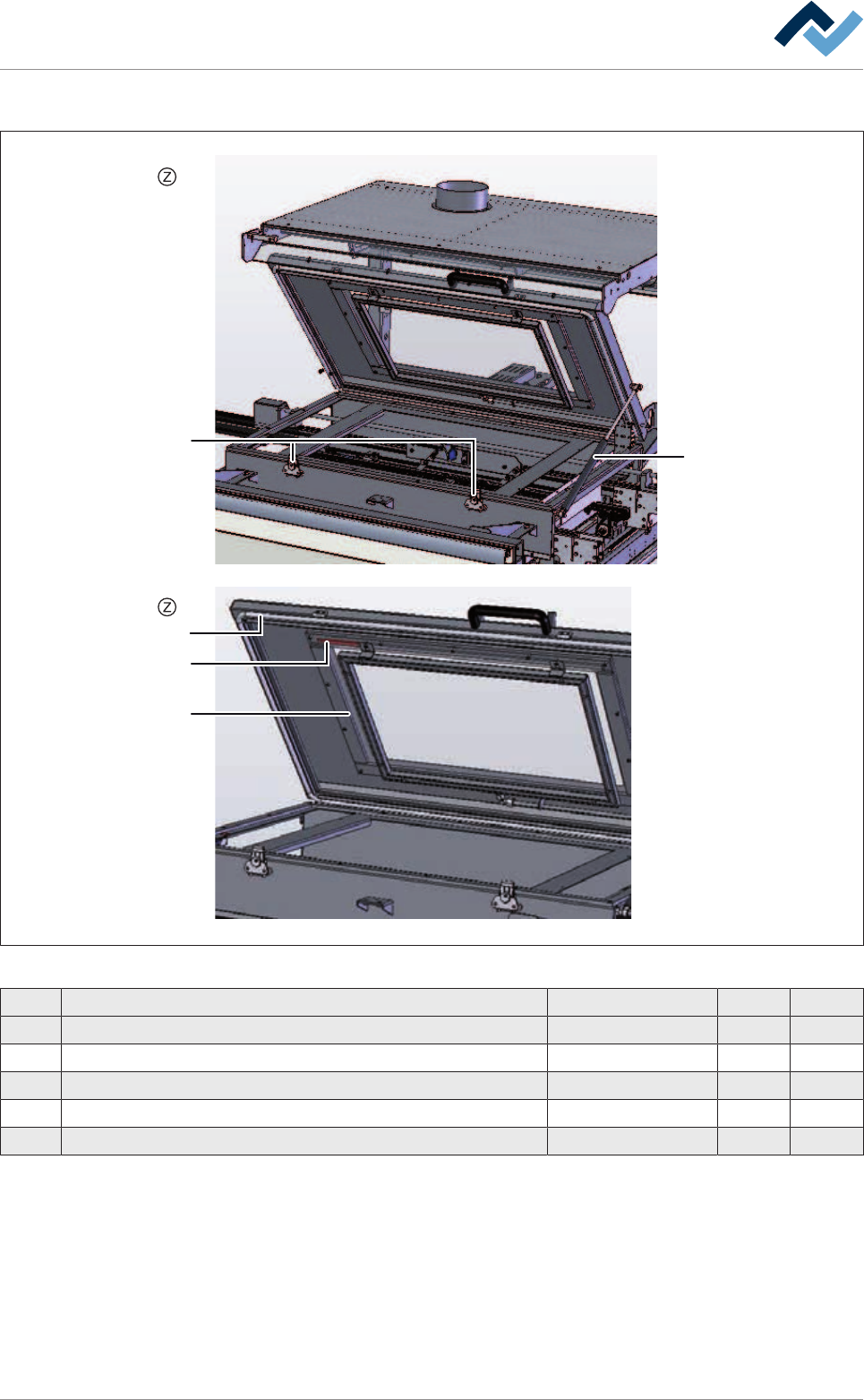 9|Spare and wear parts Gassing hood, view [Z] 1 2 4 5 3 Fig.347: EM58-21-01-00a Pos Designation Item number A B 1 Clamp closure with spring 6SPANVERS-01 x 2 Gas spring (230 N) 163756 x 3 Silicone profile, heat-resista…