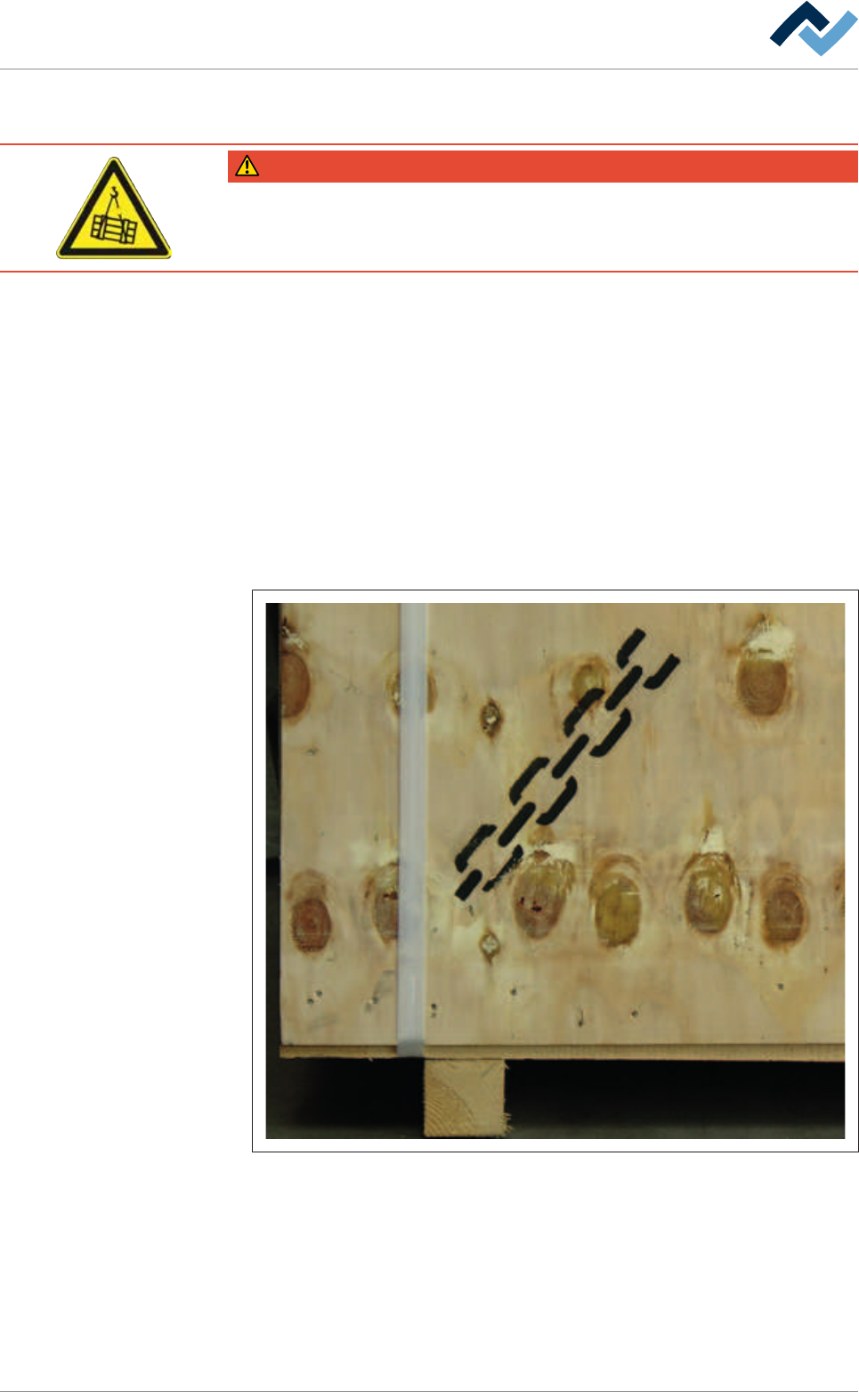 4|Transport, installation, storage, disposal 4.4.2 Unloading with a crane DANGER Severe or fatal injury from falling load! a) The crane must meet the minimum requirements as shown below! b) Lift the machine always at t…