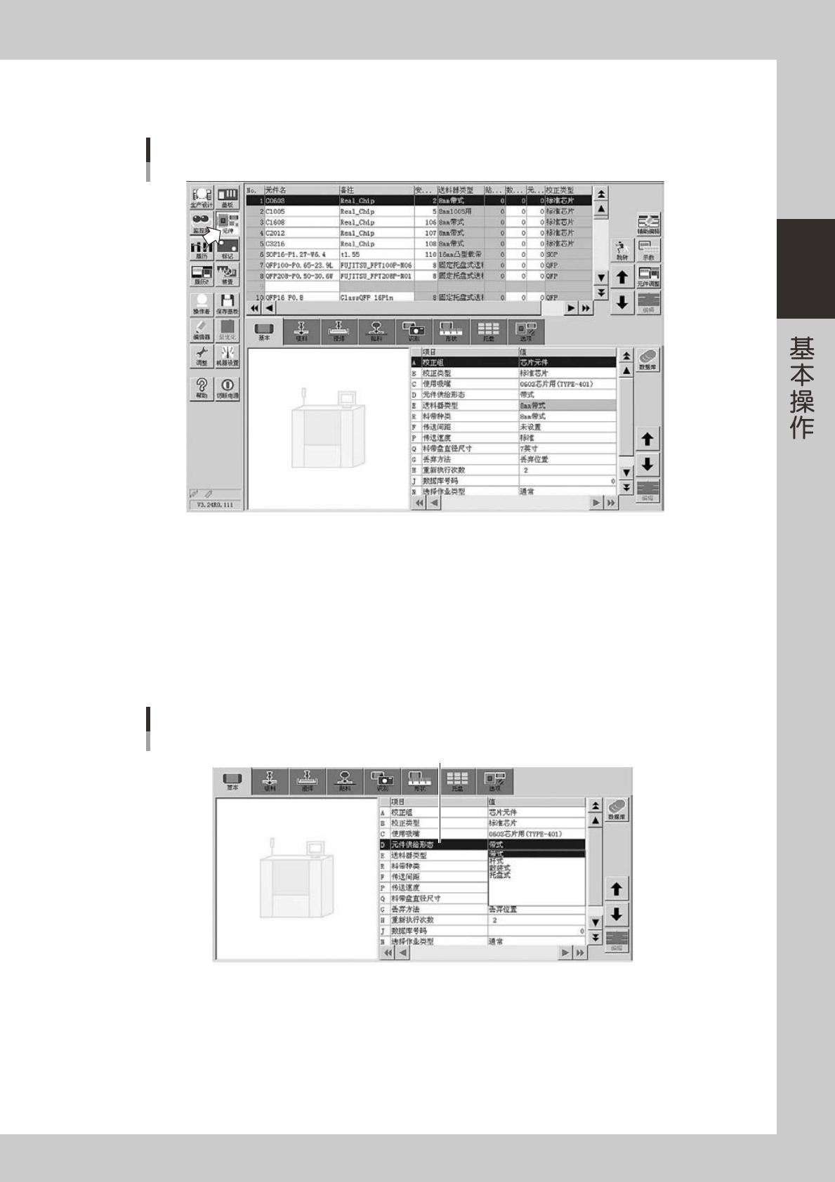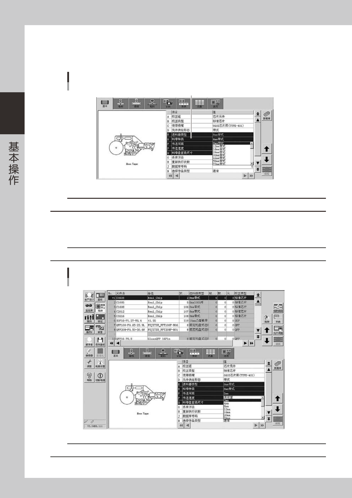 2-50 2 ■ 想要安装的是带式元件时 6 设置「料带种类」和「送料器类型」 。 选择「R 料带种类」双击输入栏后,从下拉框中选择想要使用的料带种类。 元件数据画面 「R 料带种类」 26227-H0-00 c 注意 如果更改了元件供给形态,料带种类也会随之改变,需重新设置。 7 设置「传送间距」 。 选择「F 传送间距」双击输入栏,从下拉框中选择想要设置的传送间距。 n 要点 如果「机器设置」-「选项设置」画面中的「指定送料器间距」…