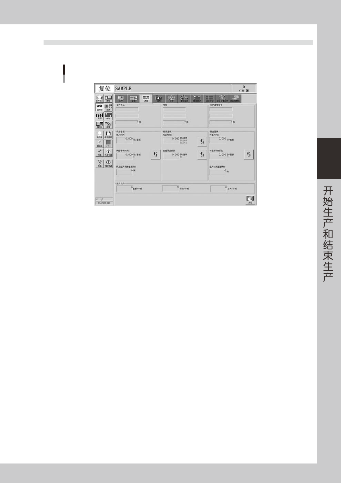 显示生产开始的时间 ( 选择完基板的时间 )。一般,生产数量设定为「0」张。