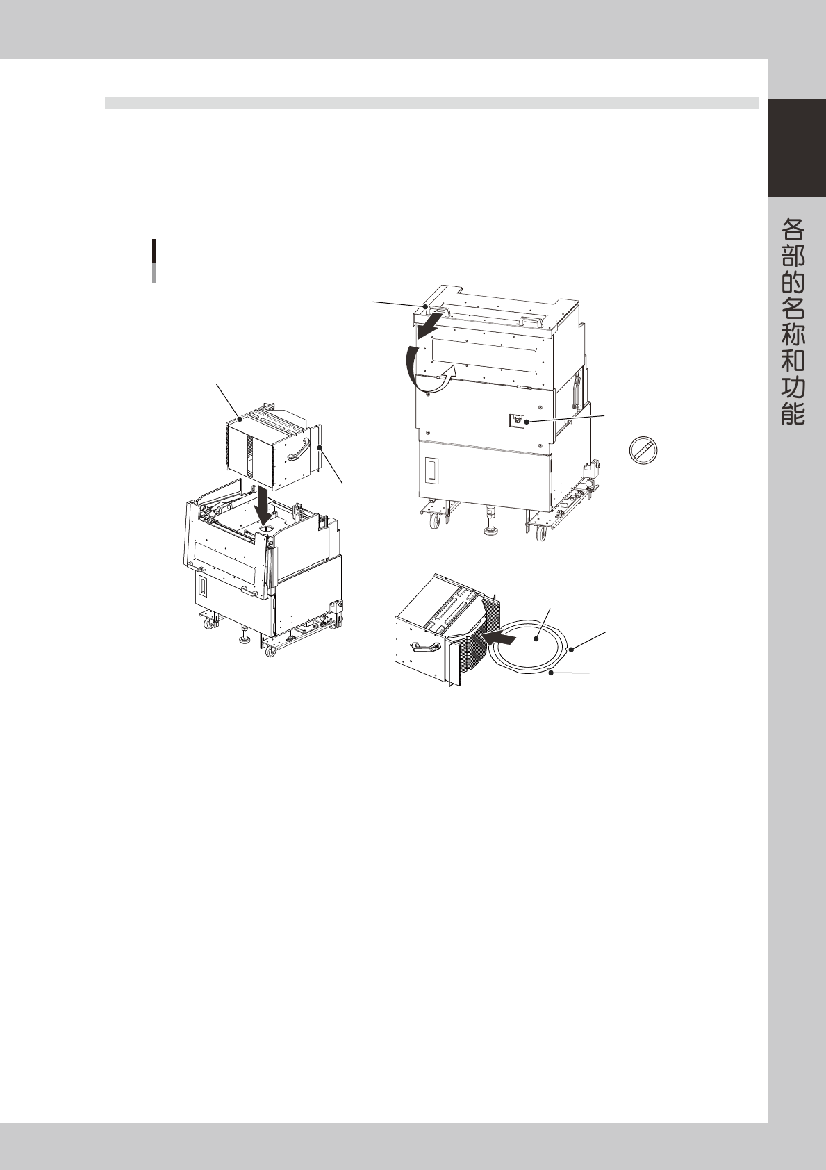 1-16 1 ■ 使用其它晶片元件时 使用 12 英寸以外的 6 英寸、8 英寸或晶片载盘时,必须使用下图所示的载料箱垫板。 晶片托盘交换器 载料箱安装位置 12英寸用载料箱 止动杆 8英寸用载料箱 6英寸用载料箱 定位销 载料箱垫板 定位孔 25120-H0-00 c 注意 使用 12 英寸的载料箱时,必须拆除载料箱垫板后再安装。