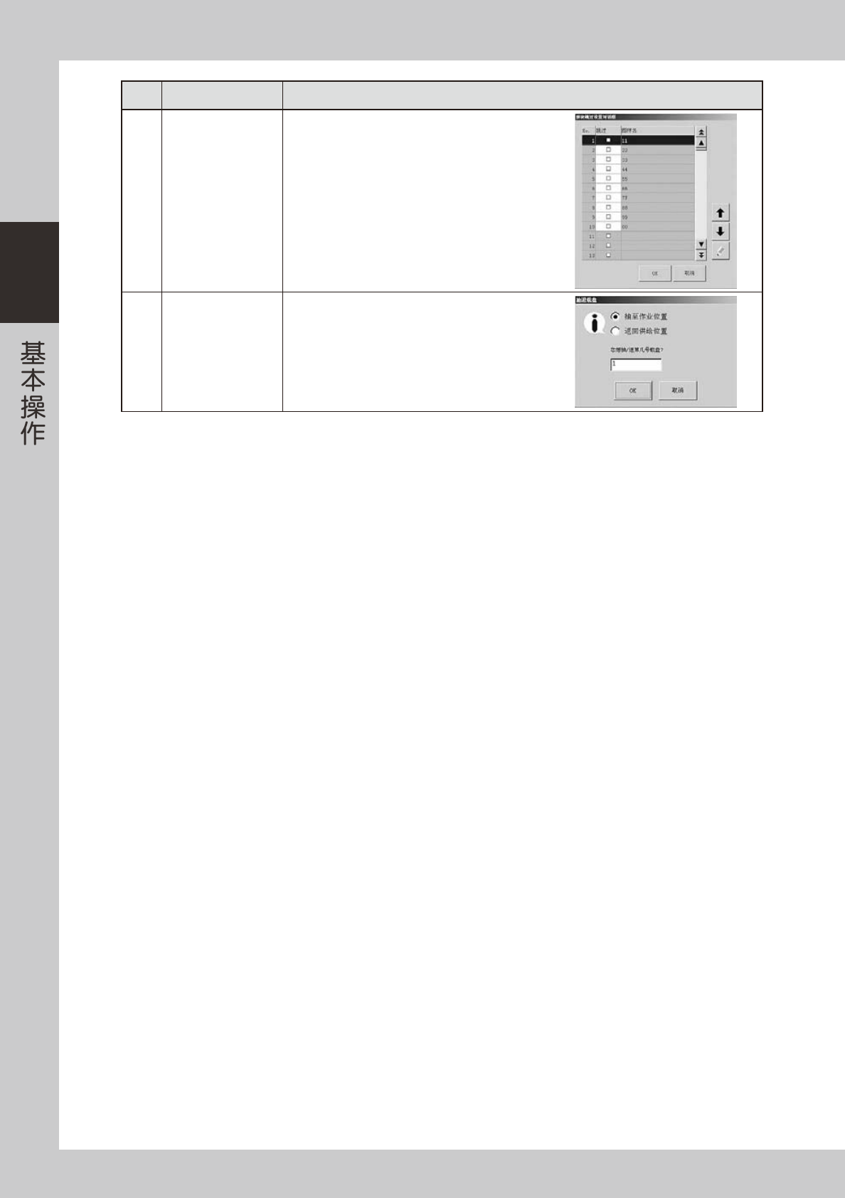 2-12 2 按钮名 功能 18 跳过拼块 读入扩展了拼块的基板程序时有效。 按此按钮,显示「拼块跳过设置」对话框, 可以以拼块 为单位设置是否要跳过贴装。 此功能, 只有将基板参数的「运行模式」设置为「贴装 / 正式点胶」时才可以使用。 19 抽退载盘 按此按钮, 打开「抽退载盘」对话框。选择「抽至作业 位置」 ,输入载盘号码,按 [OK] 按钮,可以将指定的载 盘抽至载盘台。想要将载盘退回载料箱时, 选择「退回 供给位置」 …