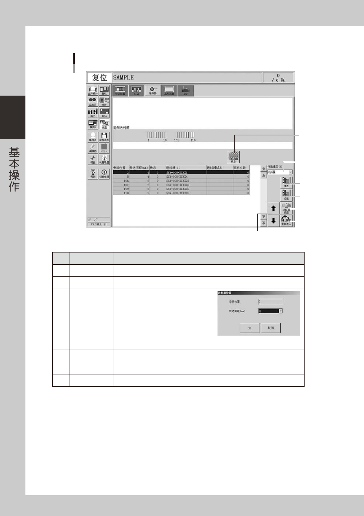 2-16 2 ■ 送料器手动操作 「装置」-「送料器」画面 1 4 7 2 6 5 3 26208-H0-00 按钮名称 功能 1 传送 每按 1 次按钮,就按照设置的间距使料带向前传送 1 个间距。 2 后退 每按 1 次按钮,就按照设置的间距使料带向后退回 1 个间距。 3 送料器设置 传送间距可以按照规格在 2 〜 56mm 的范围内 选择。 内存会自动更新为此处所设置的间距。 4 传送速度 ( % ) 传送速度,可从下拉框中在「…