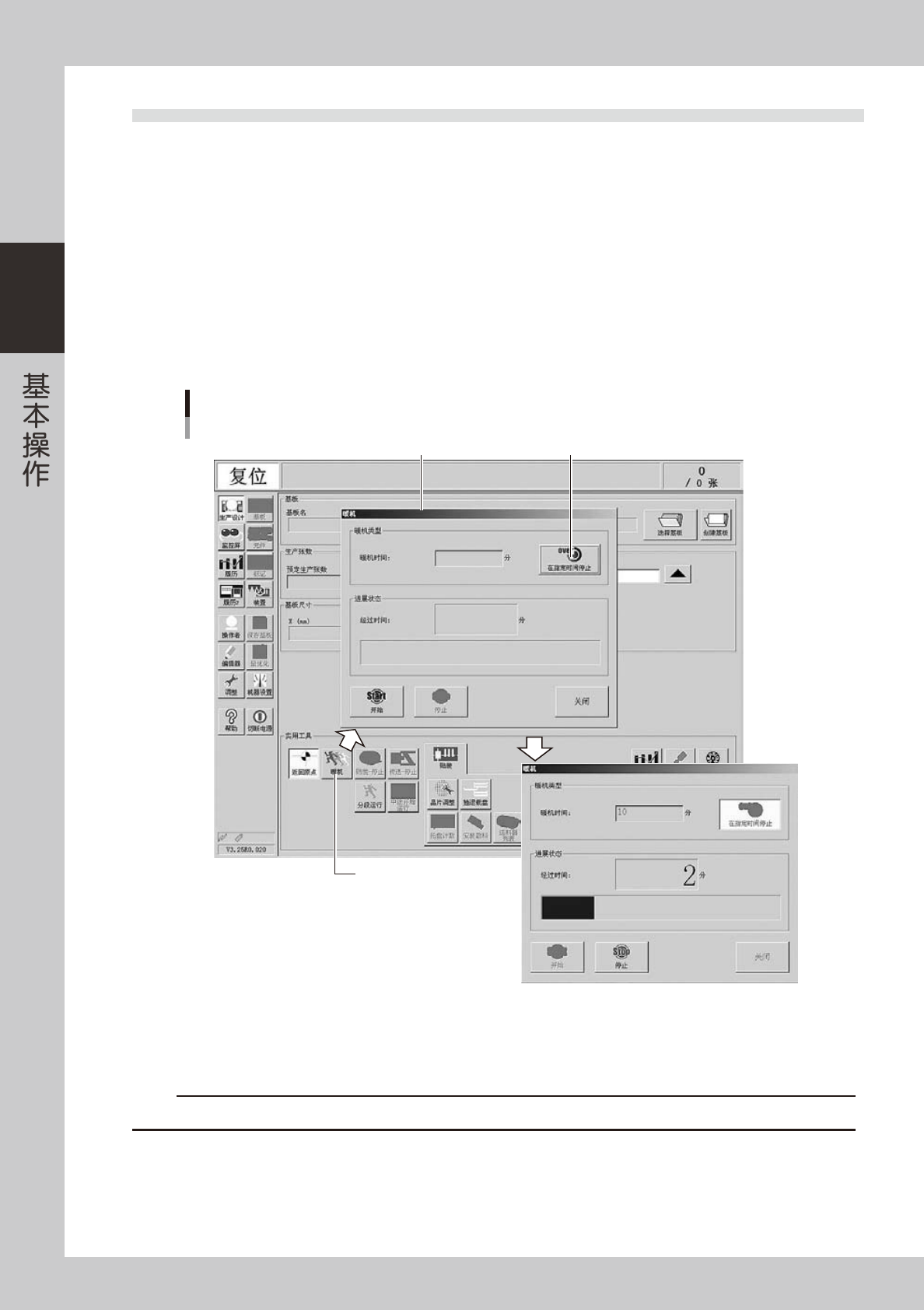 2-22 2 3.3 暖机运行 启动机器后, 必须立即进行暖机运行。暖机运行的时间大致为 10 分钟。但是, 完成上次生产两个小时之内再开机, 可省略暖机运行。 1 先进行作业前的点检,再启动机器。 有关作业前的点检项目和机器的启动方法,参阅本章「3.1 作业前的点检」的内容。 2 按生产设计画面的 [ 暖机 ] 按钮。 按生产设计画面的 [ 暖机 ] 按钮,显示「暖机」画面。 3 输入进行暖机运行的时间。 按 [ 在指定时间停止 ] …