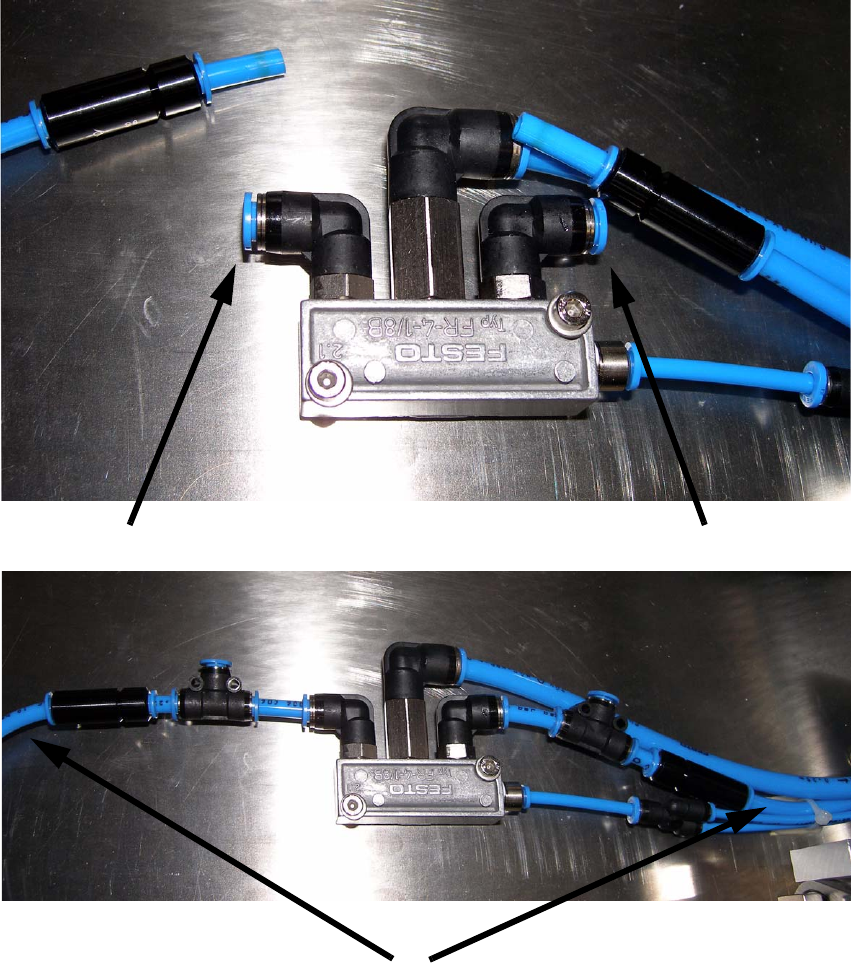 : Stecken Sie die beiden Schläuche mit den Dämpfern vom Pneumatikblock in BB 1 ab. Stecken