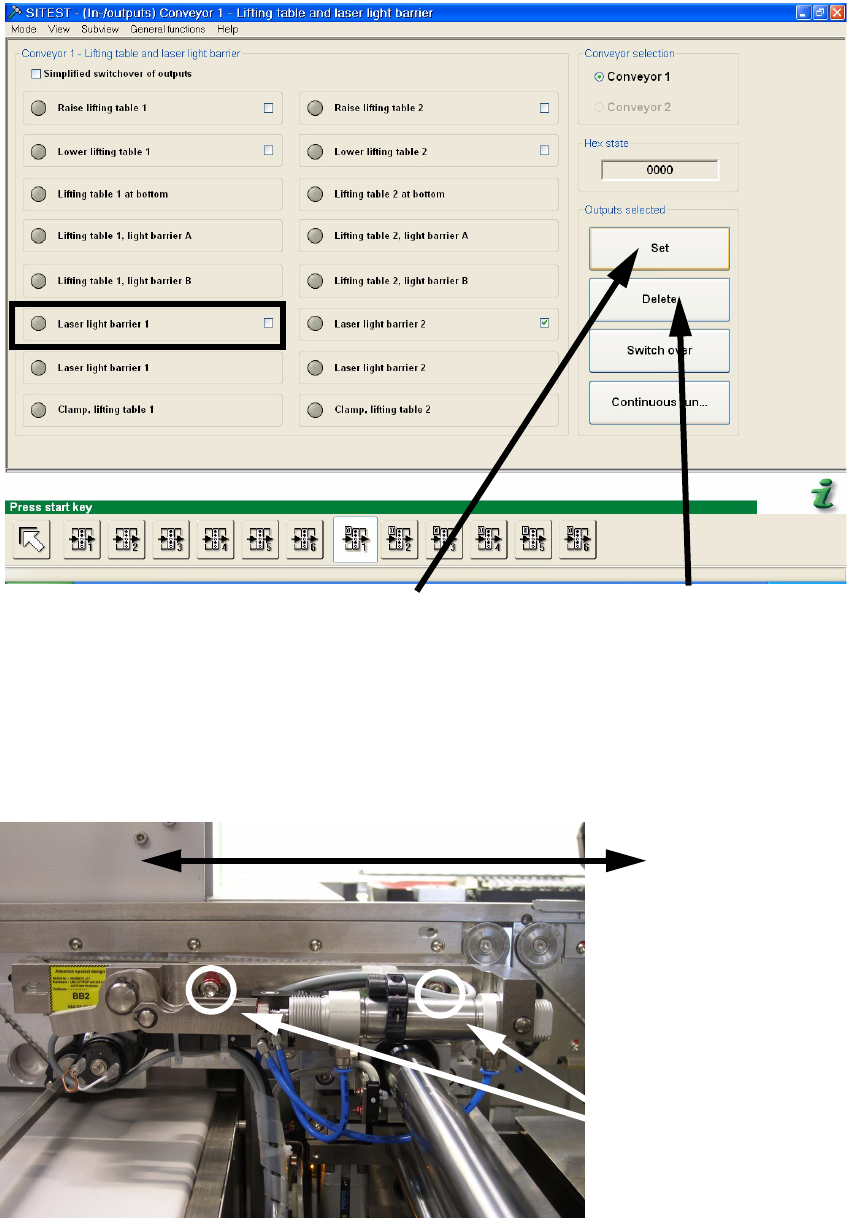 : Activate the laser light barrier 1 for the stopper adjustment in PA1 or the laser light barrier 2 for