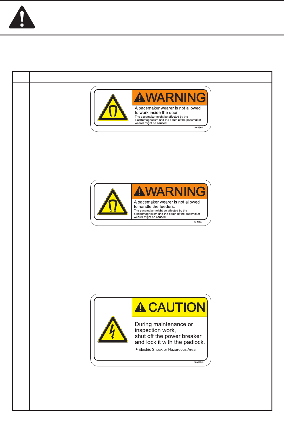 Safety Precautions Safe-25 1OM-1603 1 108-003 5. Alert Labels Alert Labels and Description No. Alert Labels and Description (1) Description Strong permanent magnets are used in the moving mechanisms of the X/Y beam. Th…
