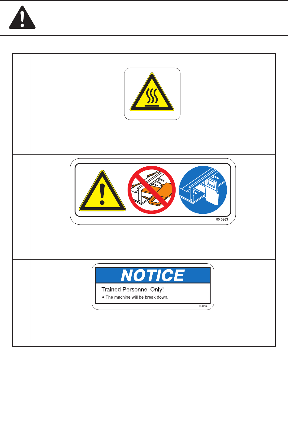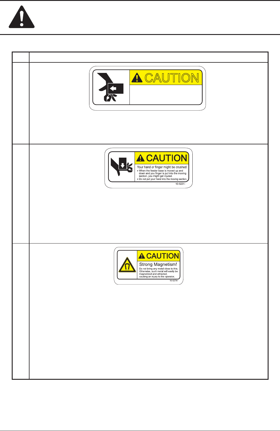 Safety Precautions Safe-29 1OM-1603 1 108-004 5. Alert Labels No. Alert Labels and Description (13) Description Do not drop a feeder . Otherwise, a foot injury will result or the feeder itself may be damaged. Carefully…
