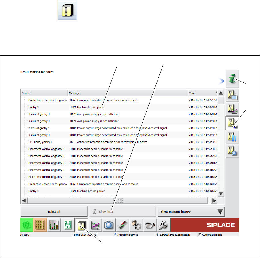 《用户手册》 SIPLACE SX1/SX2 5 贴片机上的作业 使用软件版本 SC.710.0 或更新 版本 12/2016 5.6 警报 信息和 “ 联机帮 助 ” 227 5.6.3 “ 联机帮助 ” 警报信息中的颜色编码 5 5.6.4 上下文 “ 联机帮助 ” 要查看当前视图的相关信息,单 击 图标启动工作站计算机的 帮助系统 。 帮助系统 主窗口将 随着警报信息一起被打开。此信 息指的是当前正在显示且启动了帮助功能的警报。使…