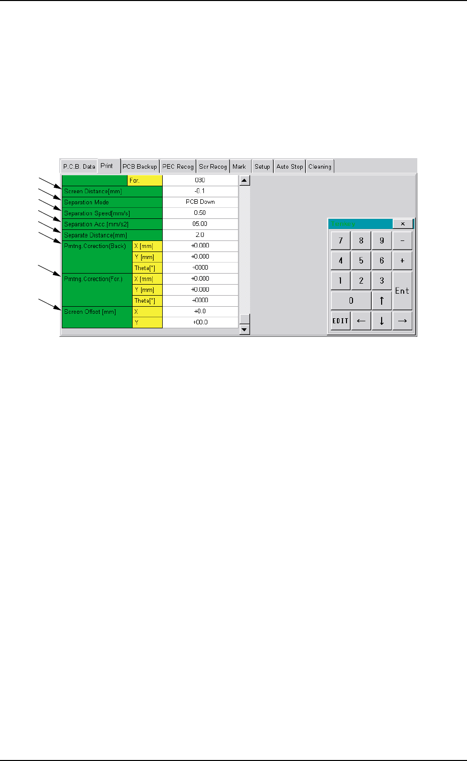 Tg0699-PM-D2 0207-001 Chapter 1 2-46 2.3 "Print" T ab *12 Prntng. Correction (Back.) Make the ten-key window appear and enter values in the "X [mm]", "Y [mm]", and " θ [ " ]" …