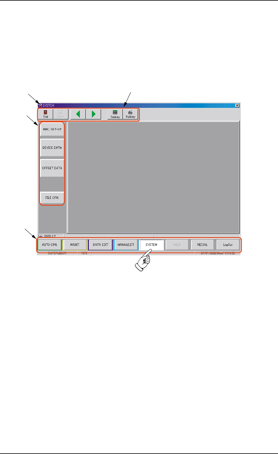 Tg0699-PM-D2 0207-001 Chapter 1 4-3 1.1 Composition of Menus for System Setting *3 Submenu Bar This bar is treated as part of the "SYSTEM" window and has the buttons to select the submenus. When a button is sel…