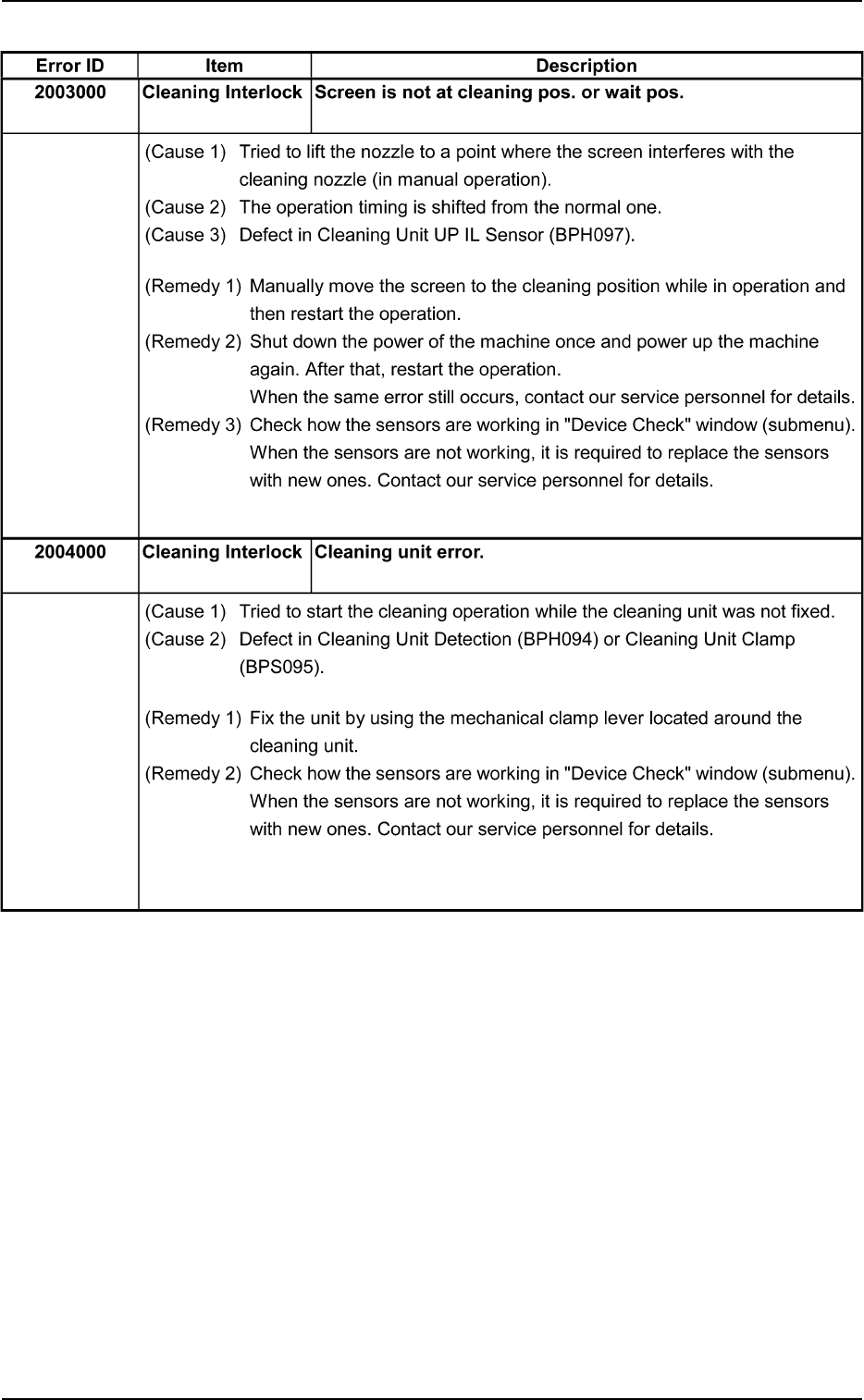 Tg0699-PM-D2 2.3 Error IDs and Remedial Procedures 0207-001 Chapter 2 2-100 T able 4B98 Error ID Item Description 2001000 Cleaning Interlock P .E.C. Recog-Y Axis is not at safety area. (Cause 1) The cleaning nozzle was m…