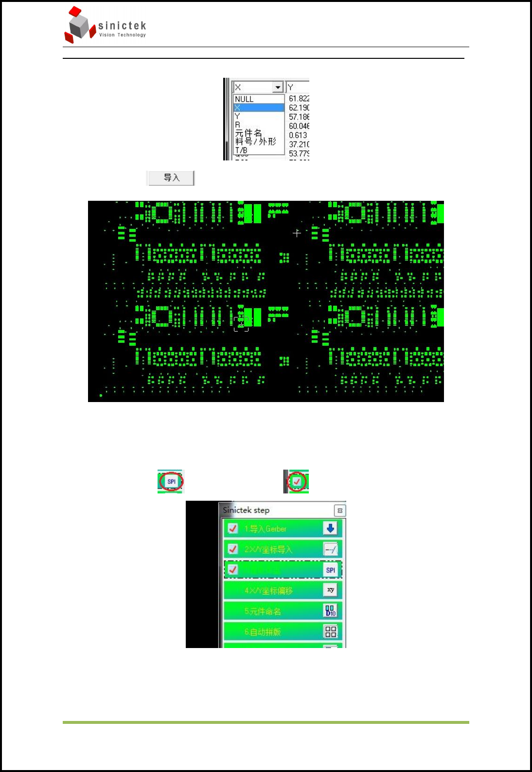 Sinic-T ek 操作手册 思泰克光电 科技有限公司 12 / 49 Co pyright by Sinic-T ek V ision T echnology Co., Lt d. 4.1.5 调整 X/Y坐标偏移 选择右侧工具栏的 后出现下图 这时需确认导入的 X/Y 数据的方向是否和 Gerber 一致,如果不一致可以选择旋 转或者镜像来调整 X/Y 数据的方向