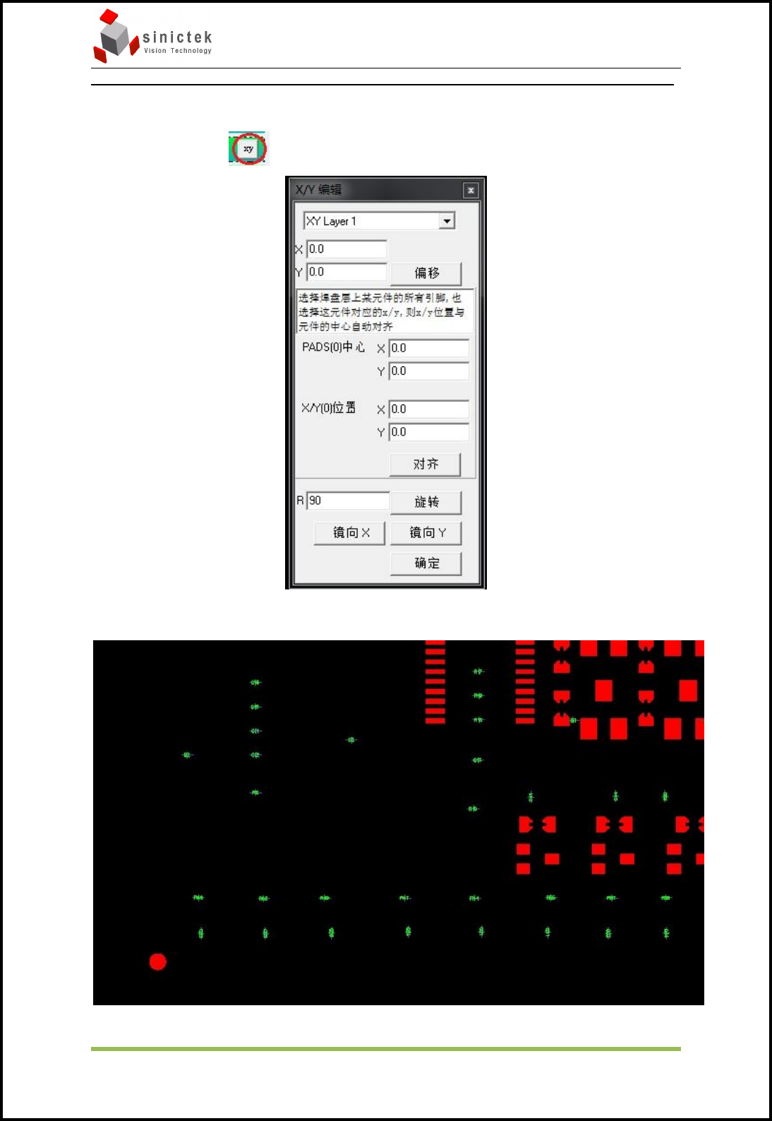 Sinic-T ek 操作手册 思泰克光电 科技有限公司 13 / 49 Co pyright by Sinic-T ek V ision T echnology Co., Lt d. 当 X/Y 数据和 Gerbe r 方向一致时,框选中单个 X/Y 数据和其对应的焊盘,如下 图 选中后 X/Y 数据会有白色的十字线, 而其对应的焊盘变成白色 。 在下图中会显 示 X/Y 数据坐标和焊盘中心位置坐标。 当有焊盘中心位置坐标和 X/Y …