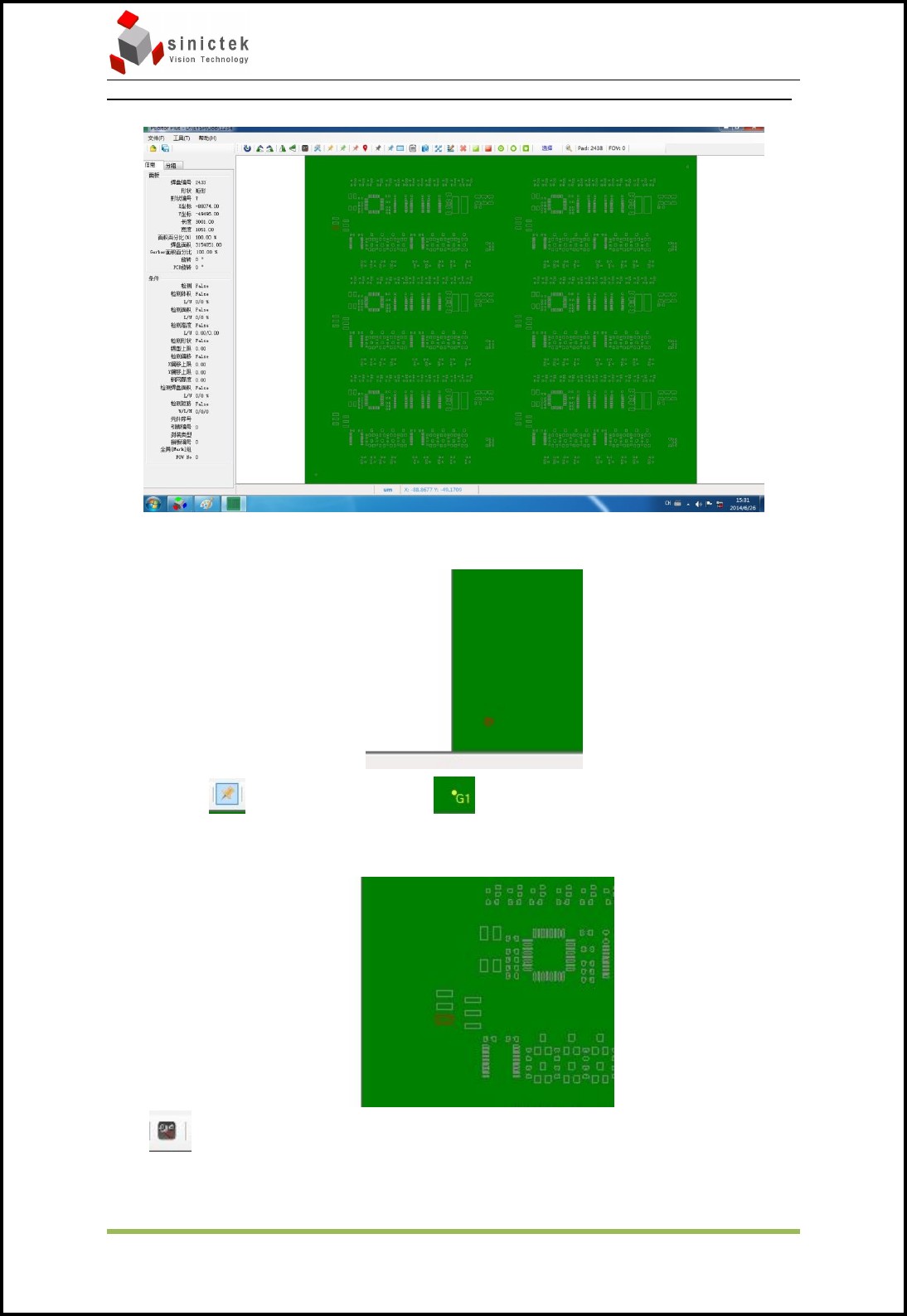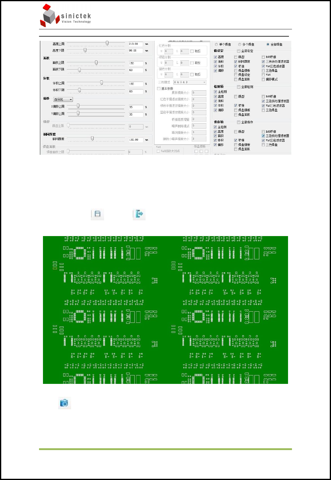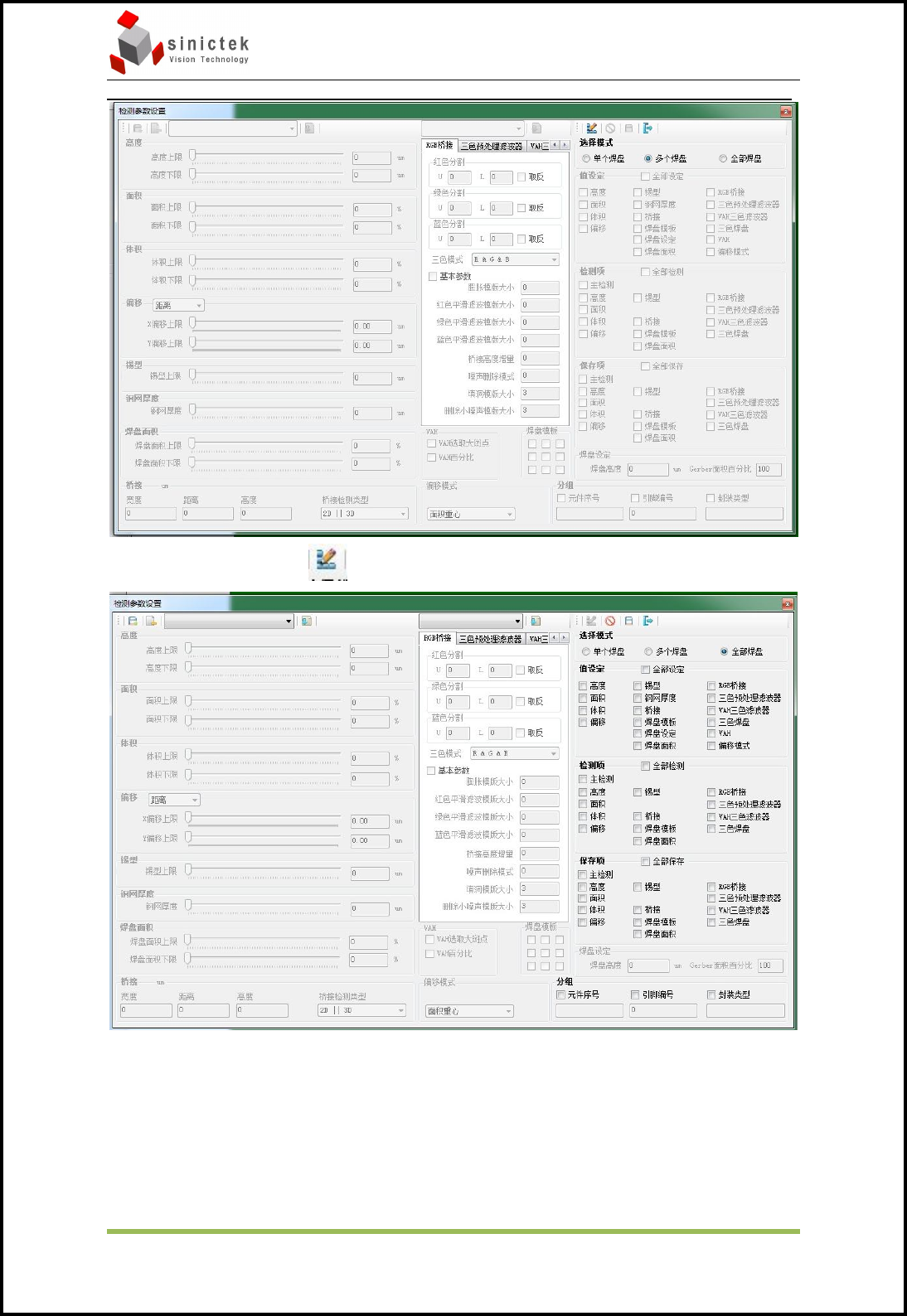 Sinic-T ek 操作手册 思泰克光电 科技有限公司 20 / 49 Co pyright by Sinic-T ek V ision T echnology Co., Lt d. 选择全部焊盘,并点击 ,点击后右侧变为可修改 选中右侧值设定中的项目左侧对应的变为可修改, 然后可以设置选中项目的参数