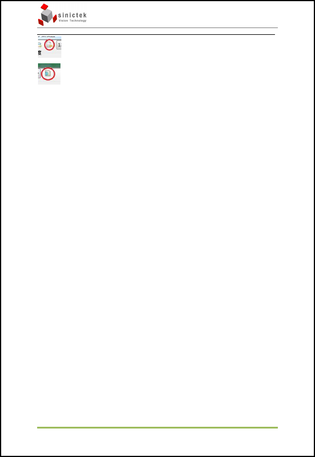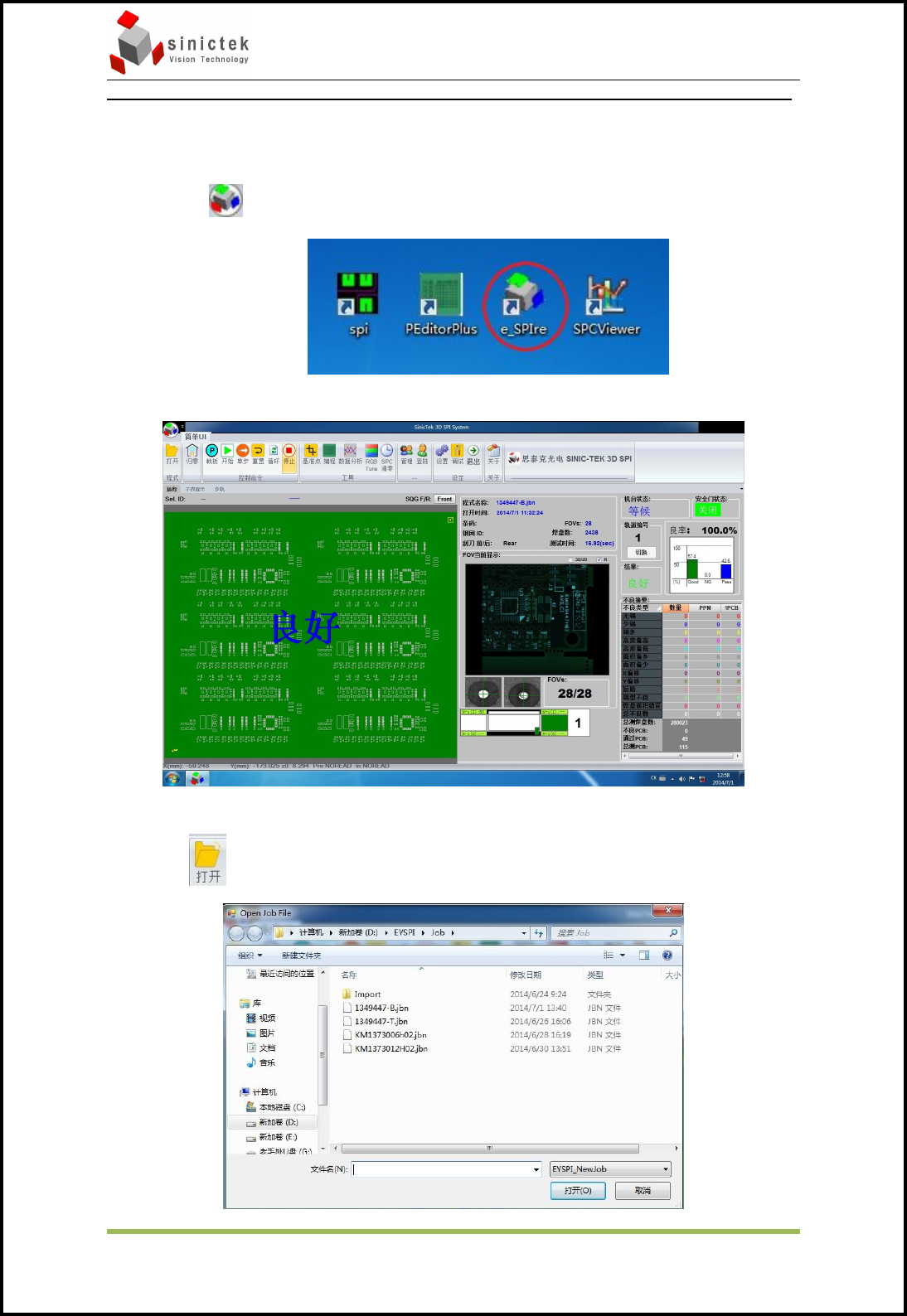 Sinic-T ek 操作手册 思泰克光电 科技有限公司 25 / 49 Co pyright by Sinic-T ek V ision T echnology Co., Lt d. 4.3 如何 使用检测 J ob 程序进 行检测 4.3.1 打开软件 从桌面双击 打开UI主界面。 打开后如下图 4.3.2 打开 JOB文件 点击打开 跳出选择界面
