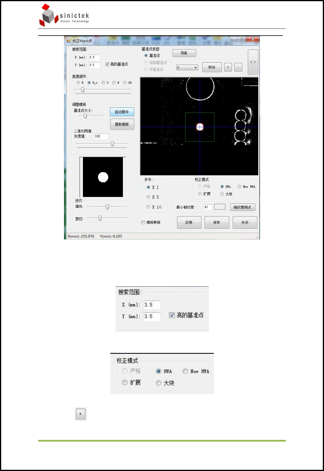度,调整二值化阀值里的灰度值让Mark点图像清楚,然后选择自动居中让红色框