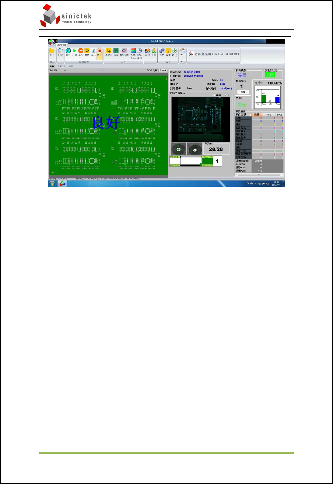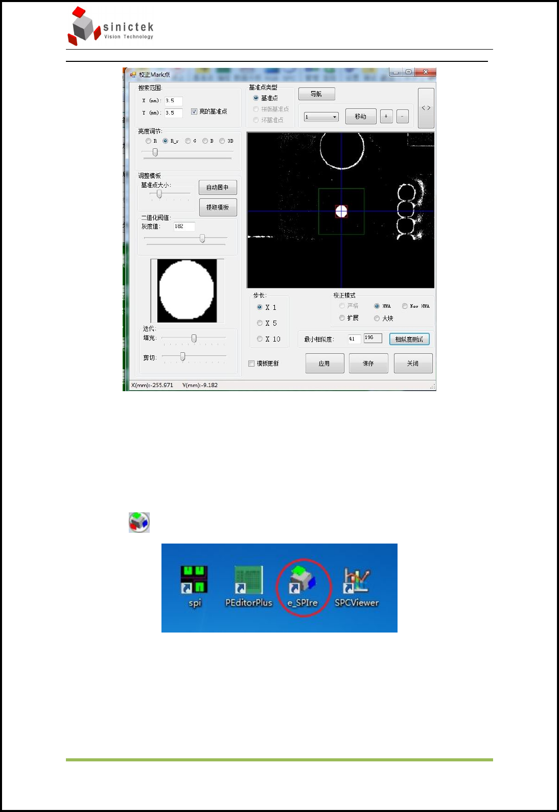 Sinic-T ek 操作手册 思泰克光电 科技有限公司 29 / 49 Co pyright by Sinic-T ek V ision T echnology Co., Lt d. 移动到第二个Mark点后, 选择相似度测试 , 看红色框是否和Mark 点相切, 相似度 值是否超过41,OK后点击关闭。 五. 软件界面的介绍 5.1 用户 主界面U ser In terfa ce 从桌面双击 打开UI主界面 打开后如下图