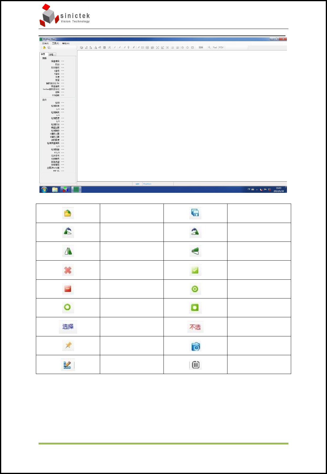 Sinic-T ek 操作手册 思泰克光电 科技有限公司 32 / 49 Co pyright by Sinic-T ek V ision T echnology Co., Lt d. 打开文件 保存文件 逆时间旋转 顺时间选择 X镜像 Y镜像 删除选中焊盘 检测选中焊盘 不检测选中焊盘 选择所有焊盘 不选择焊盘 反选焊盘 框选中的焊盘为 选择状态 框选中的焊盘为 不被选择状态 设定为Mark 设置FOV走位 编辑修改界面 取消显示FO…