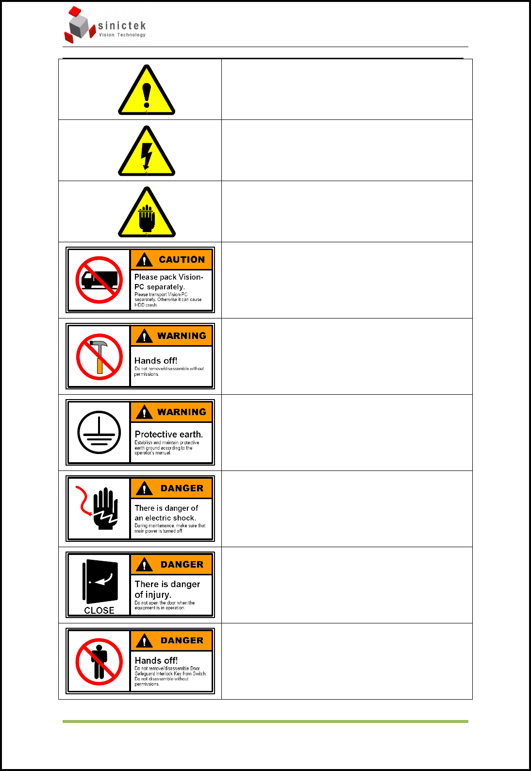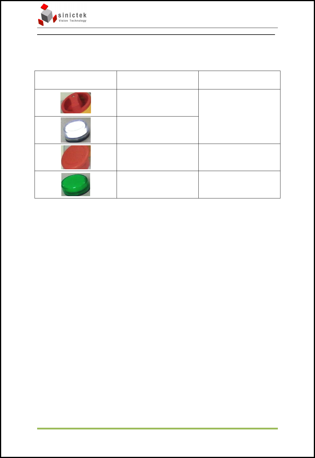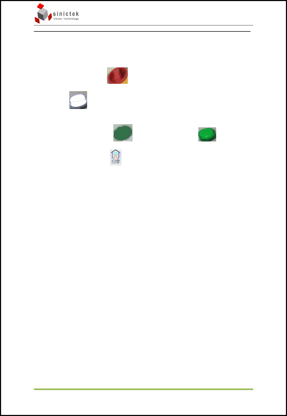 Sinic-T ek 操作手册 思泰克光电 科技有限 公司 5 / 49 Copyrig ht by Sinic- T ek V ision T echnology Co., L td. 二. 装置开关及指示 灯 示例图片 器件名称 工作状态 装置电源开关 当电源开关打开, 白色电 源指示灯亮 电源指示灯(白色) 紧急停止开关 按下此开关, 机器的工作 会停止 运行指示灯(绿色) 此 灯 亮 说 明 装 置 处 于 运 行或待机状态