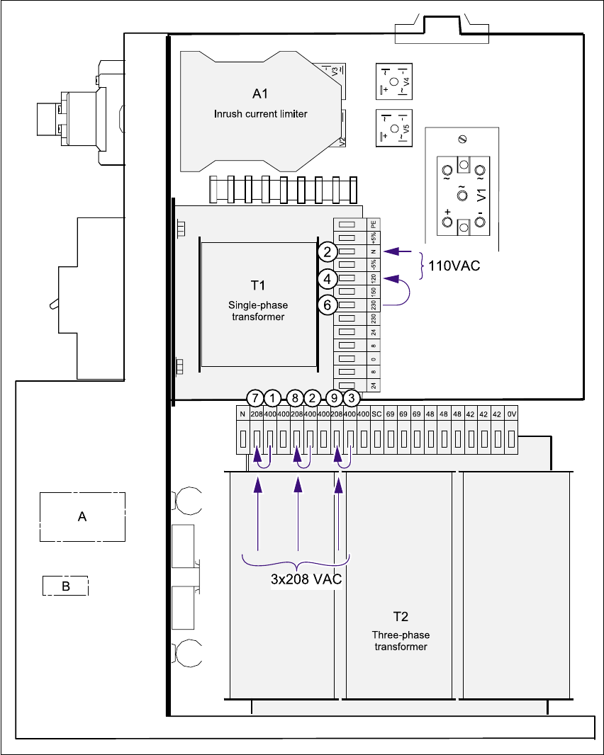Fig. 3 - 2 Terminals on transformers T1 and T2 and the inrush current limiter