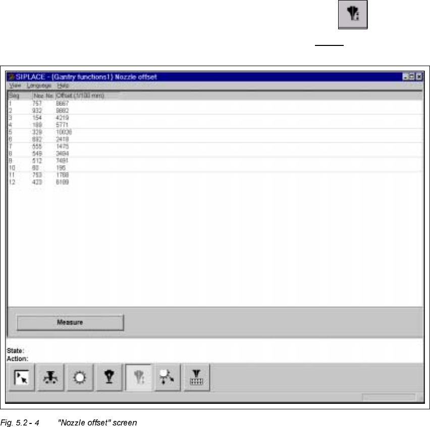 User’s Manual SIPLACE HS-50 5 Single Functions Software Version S R.501.xx Edition 01/99 5.2 Single functions, Gantry 161 )XQFWLRQV In the "Noz zle offset" screen only the "Meas ure" but ton …