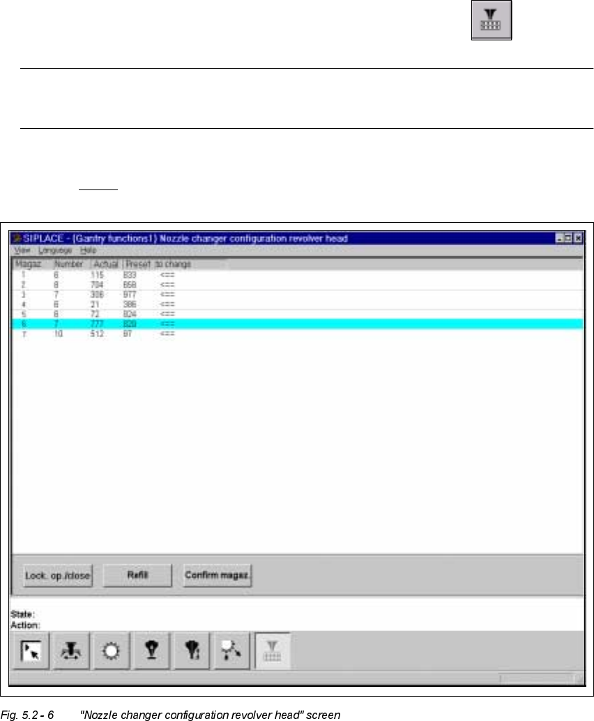 5 Single Functions User’s Manual SIPLACE HS-50 5.2 Single functions, G antry Software Version SR.501.xx Edi tion 01/99 166 1R]]OHFKDQ JHUFRQ ILJXUDWLRQUHYROY HUKHDGVFUHHQ Å In th e current screen for the s…