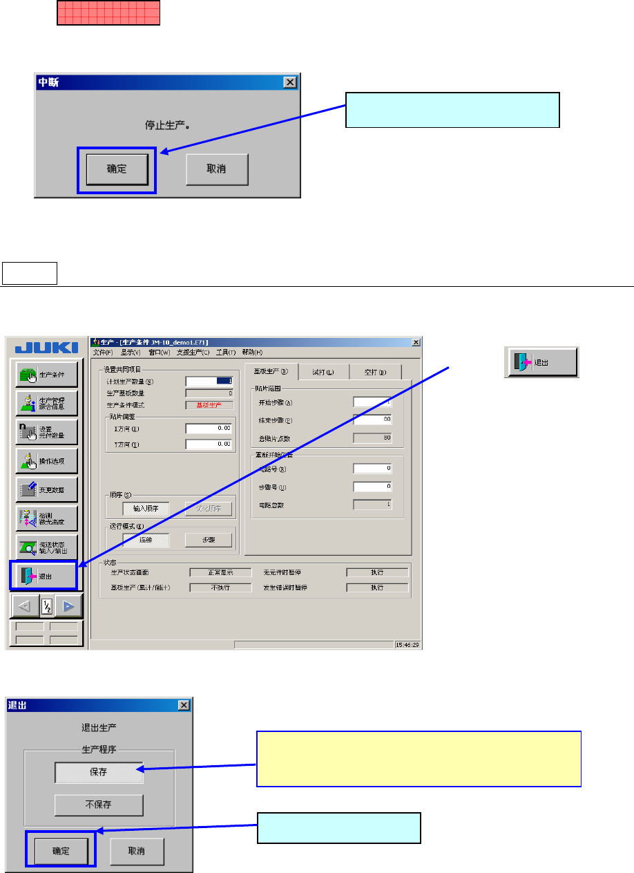 操作手册 2-26 步骤 8 执行生产 在“基板生产”画面上设置“计划生产数量”后,再按下[开始]开关。 生产即开始。(生产画面的详细内容,请参见『使用说明书』的“2-8-2 生产条件画面”。) ① 进入生产画面。 ② 开始生产。 <操作面板> 请按下 生产即开始。 ③ 插入基板。 开始开关 按下[开始]开关后装置即开始运行。为防止受 伤, 请绝对不要把手 或头部等伸进装置内部 。 警告 ※在完成指定的生产数量时, 或按下[停止]开关时…