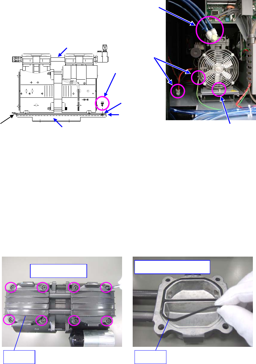 操作手册 3-13 3) 拆下连接真空泵的气管①、 再拆下线綑(电源、地线)②、 把固定 VAC_PUMP_PLATE ③的 六角凹头螺栓 (M4×8)④拆下来。 4) 把真空泵从主体中取出。 (取出时,请注意线綑。) ※ 取下真空泵时,真空泵托架⑤与橡胶薄片⑥有时会粘连。 剥开粘连的橡胶片时,请在操作中不要把手碰到周围的部件。 ※ 取下真空泵时请不要手持連接管⑦。 { 密封垫的更换 1) 取下泵头盖的 4 个(左右合计共 8 个)内六…