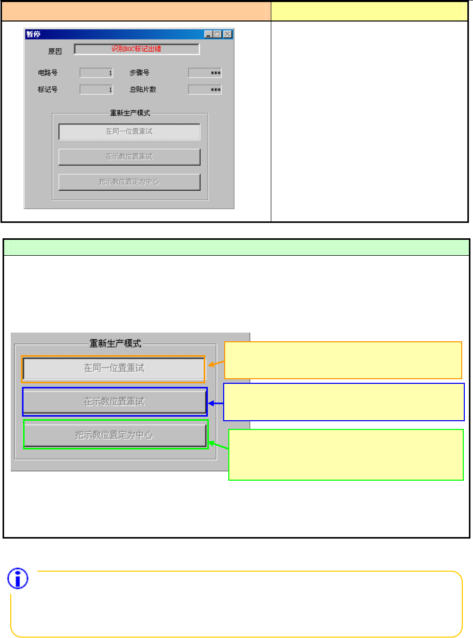 1) 遇到「激光脏污错误」时,贴片头将移动到前面后暂停。
