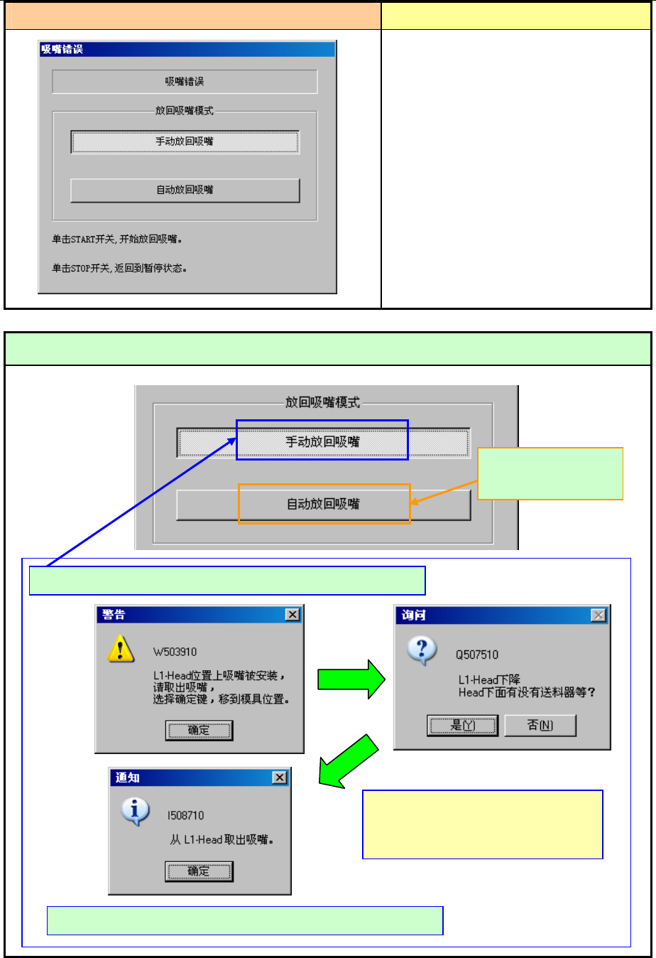 1) 请选择「放回吸嘴模式」,按下开始开关。