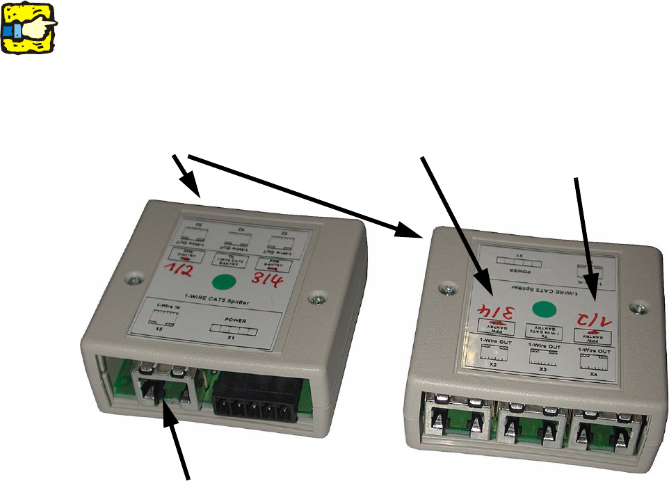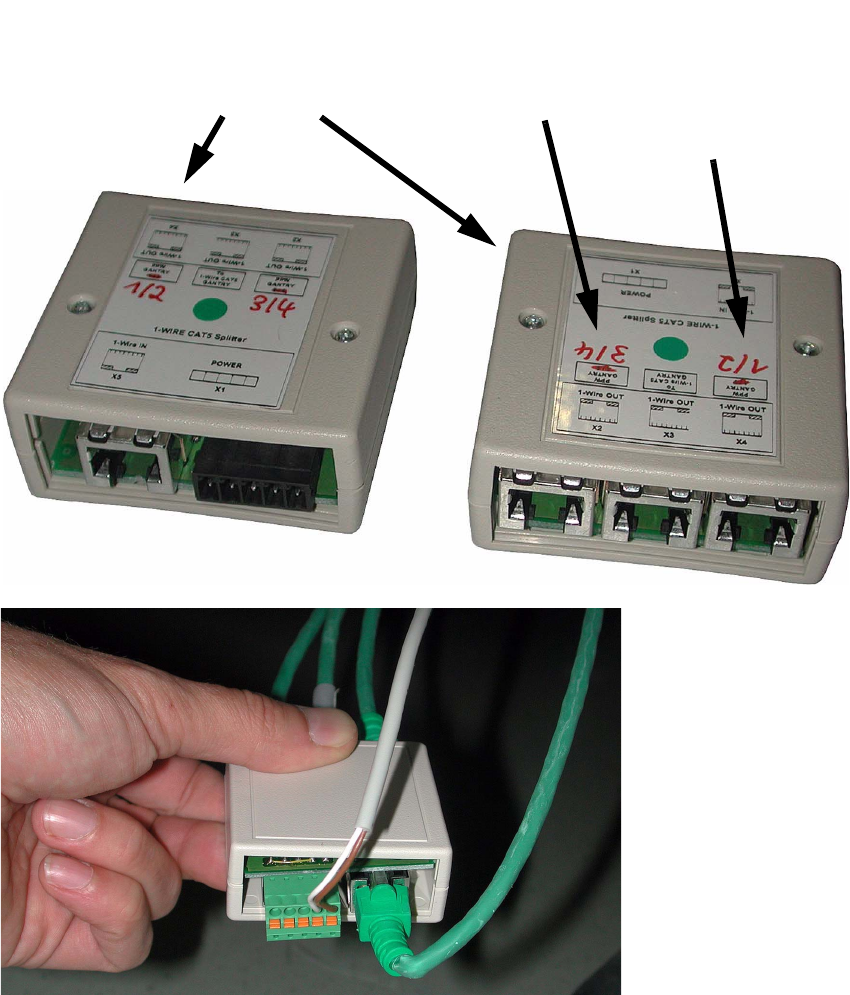 : Benutzen Sie den grünen Stecker, um das lange 24V-Kabel an den 1 Wire CAT5 Splitter an-