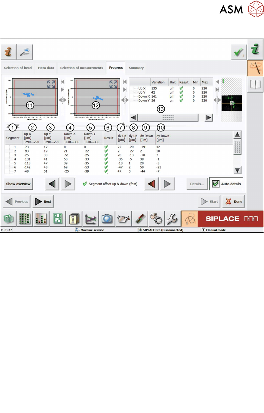 6 Description of the test results 6.19 Segment offset up & down (fast) 74 Software Manual SIPLACE Head Verification 03/2018 13 Table showing an overview of the largest and smallest value determined: ● UpX = UpX max…