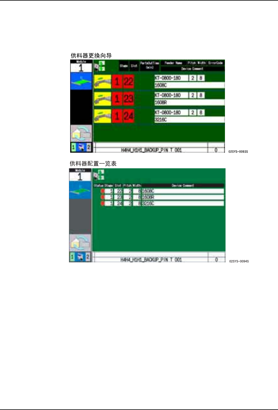 5. 换线 QD049-04 114 AIM 系统手册 5.3 供料器的更换 5.3.1 更换供料器操作的向导画面 每 按 一 下O K按 钮 就 会 在[供 料 器 更 换 向 导 ]与[供 料 器 配 置 一 览 表]画 面 之 间 切 换 。 在 [ 供料器更换向导 ] 画面上能够知道需要哪种供料器。按照以下的优先 顺序来显示。 · 下一群组中的供料器不是可以生 产的供料器。 · 初始供料器比次供料器优先显示 。 · 相同条件下,…