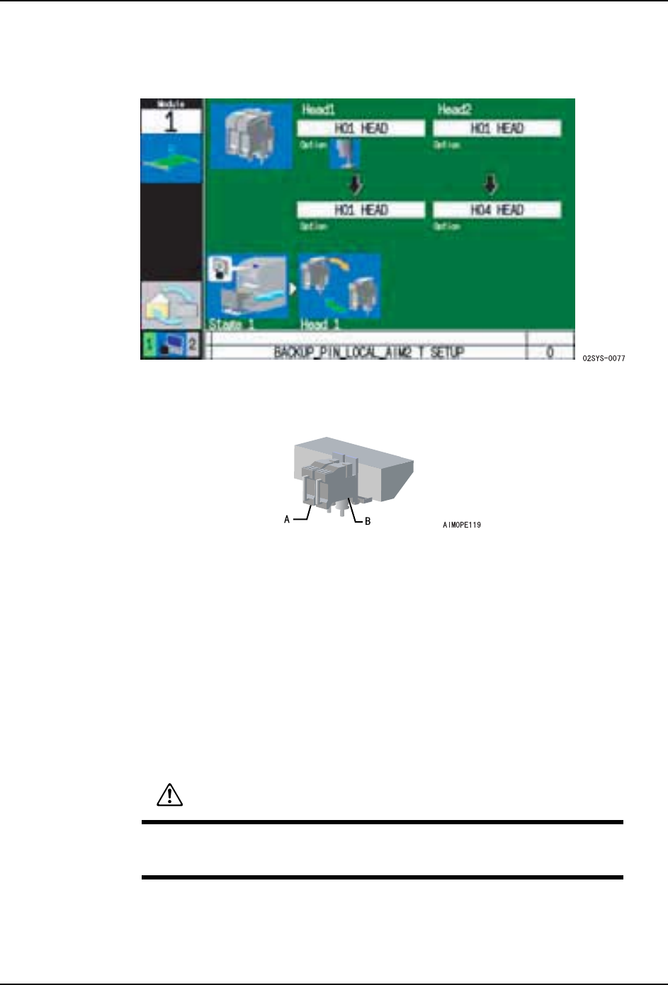 5. 换线 QD049-04 148 AIM 系统手册 5.9 工作头的更换 5.9.1 工作头更换的向导画面 备注 ) 根据 Job,必须更换贴装工作头的类型 (从 1 吸嘴工作头到 8 吸嘴工作头或从 8 吸嘴工作头到 单吸嘴工作头) 。通常在更换工作头种类的同时,有必要进行吸嘴置放台的更换。 备注 ) 画面上所显示的 “A” “B”表示工作头的位置。 5.9.2 工作头的卸下和安装 1. 机器判断出需要更换工作头时,工作头更换示意…