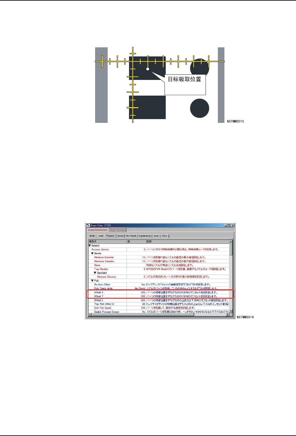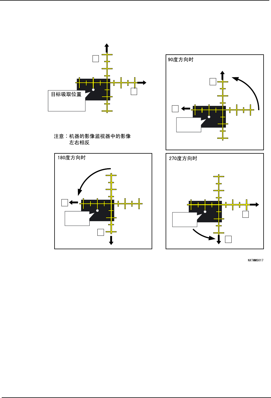 从吸取位置确认的结果中进行 Job 的吸取修正量设定。以下图所示的吸取位置的修正量为冽