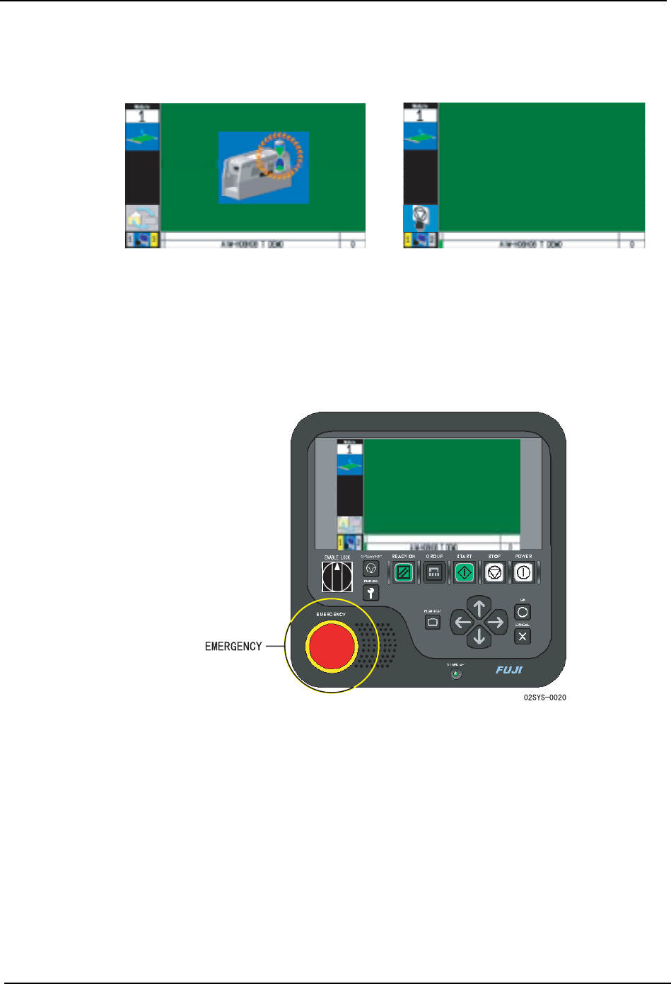 1. 在生产中发生紧急事情时请按下 “EMERGENCY” 。机器就会立即停止。
