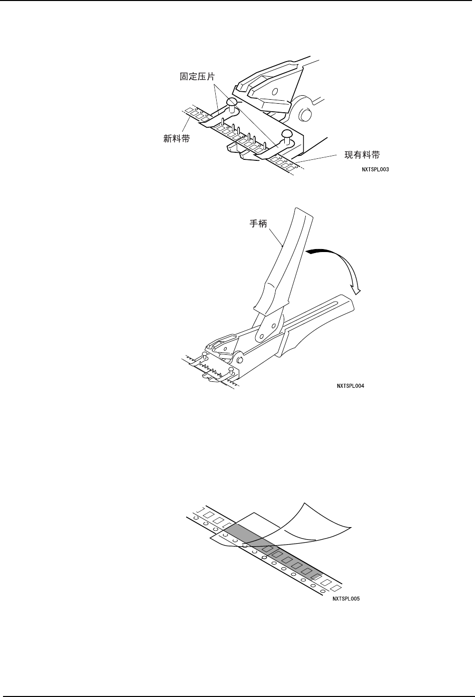 12.紧紧握住料带拼接工具的手柄,用料带拼接用薄片连接双方的料带。