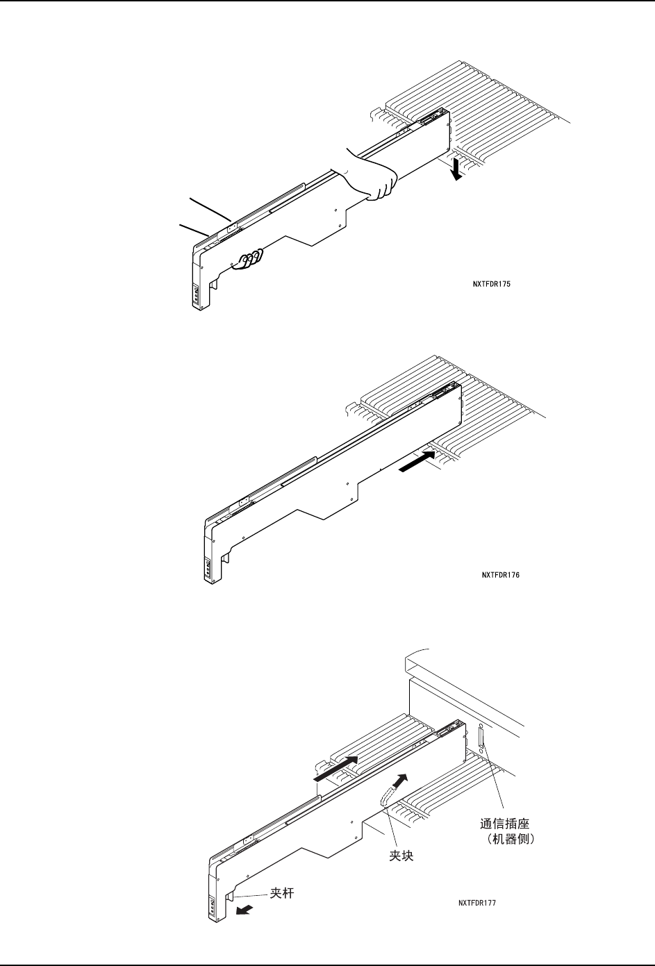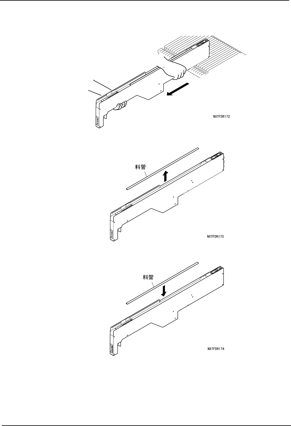 QD049-04 4. 生产 AIM 系统手册 55 3. 接着,请托住料管供料器的前方,拉出供 料器。 注意 ) 为了防止落下,在拉出时,请用力握住料管供料器。 4. 请拆下空料管。 5. 请小心放置新的料管。