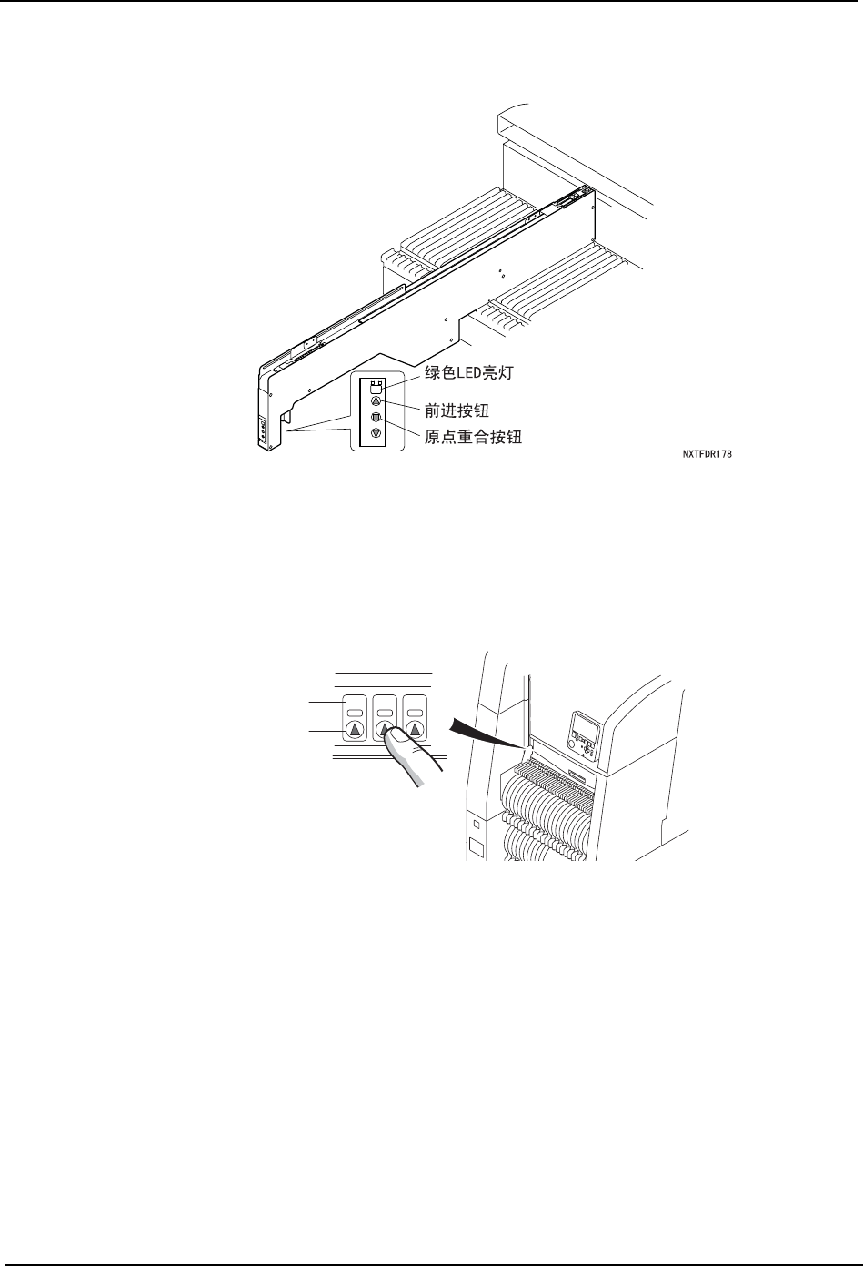 10.按下前进按钮使元件前进。接着,请按住原点重合按钮将最前面的元件放置到吸取位