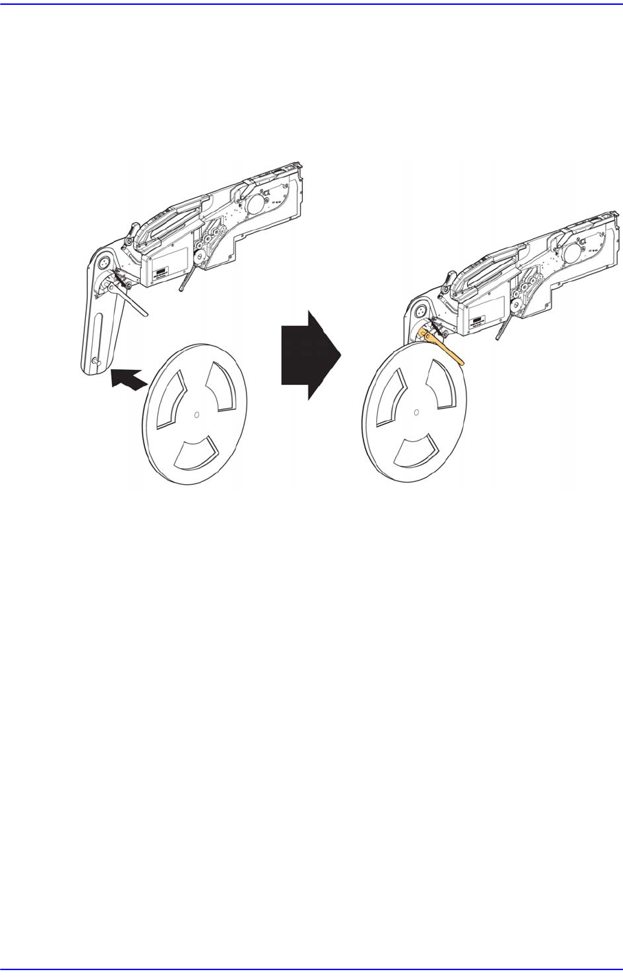 2-10 SM-Series SME 带式喂料带式器的操作手册 2.2.2. 卷轮固定 注意卷带方向如下图所示固定卷轮 。 在带式供料器方面, 把料盘插入料盘柱 (post) 后放进料盘制动器的 ‘ ㄷ ’ 型槽并加以 固定。 图 2.13 12~88mm 喂料器卷轮固定