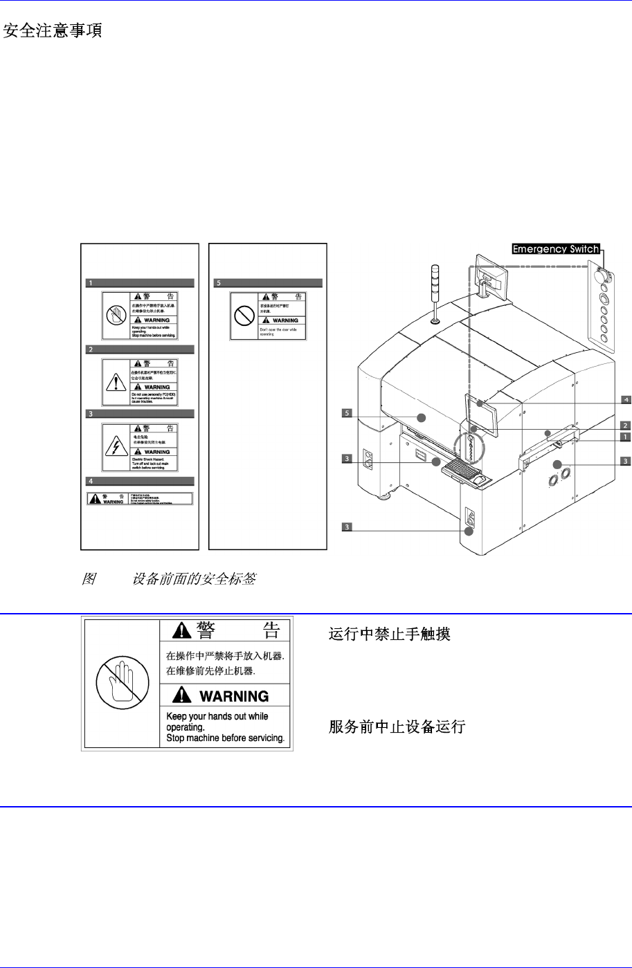 前言 iii (Safety Precaution) 如下图所示,设 备在各指 定的位置上贴 有标签。应按照 各标签上的 指令安全操 作设 备。如果某个标 签掉下来 或有毁损,应 对照下面的数字 将新表签贴 在适当的位 置。 关于订购新标签 或其它任 何问题,改善 或建议,请联系 本公司营业 部门或本公 司指 定的 C/S 中心 (STS) 。 设备前面 设备前面贴有以下标签 0-1. 贴有此标签的位置设置 有移动体,在运行时 如…