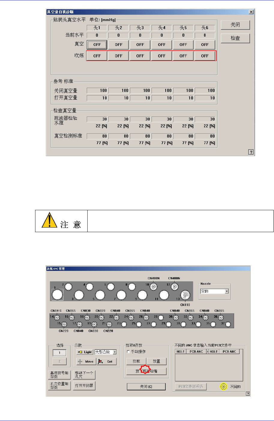“Vacuum Diagnosis” 对话框中打开所有Head的Blow后,关闭所有Vacuum。