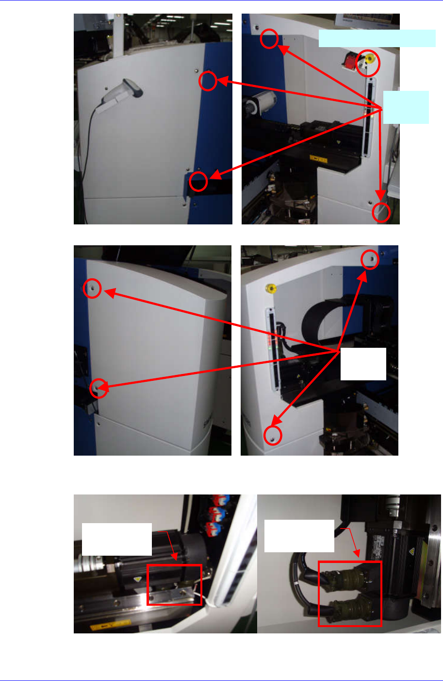 X-Y Fr ame 6-19 [Y1 轴电动机替换时除去 ] [Y1 轴电动机替换时除去 ] 4. 从 Y 轴电动机 分离出电动机电源及放 大机电缆连接器。 5. 请 除 去连 接 Y 轴 电 动 机 和 滚 珠 丝 杠的 联 接器 Set Screw(M4) 。 但 , 只 替换 Y 轴 电 动机时,只除 去离电 动机近的 Set Screw ,只替 换滚珠 丝杠时,只 除去离滚珠 丝 除 去 固 定 螺丝 Y 1 轴 电 动 机 …