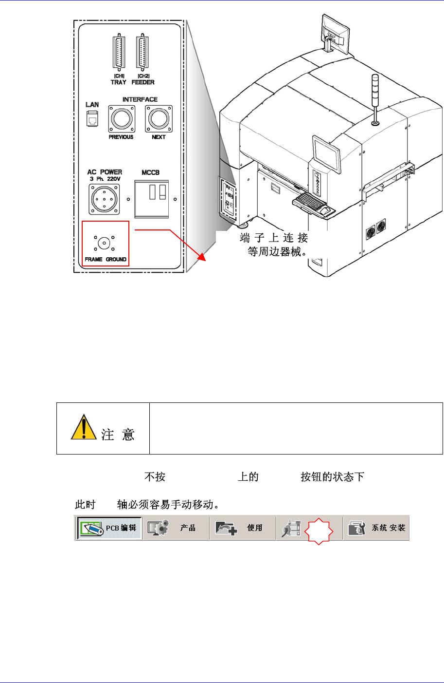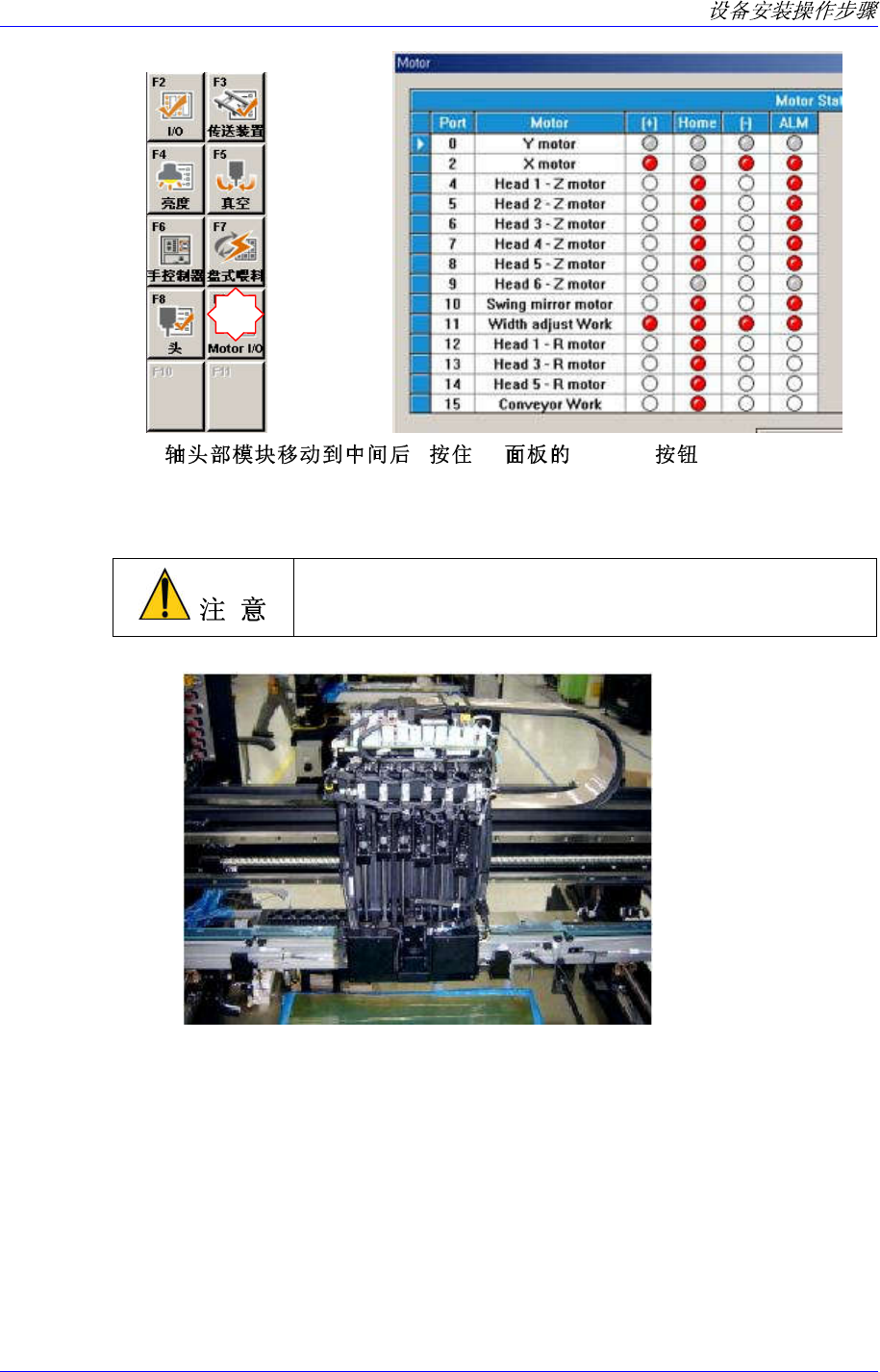 Samsung Component Plac er SM321 Service Manual 2-14 2.1.5. Motor I/O 确认及 Skew Compensation 2.1.5.1. 作业顺序 1. 在打开 Main Switc h 前 , 再次检 查 确 定 设备 内部 或 传 送装 置 (Conveyor) 上 是否 有 任何障碍 . 2. 如果设备周边是干净的,打开 Main Switch 。 连接设备电源 此时请…