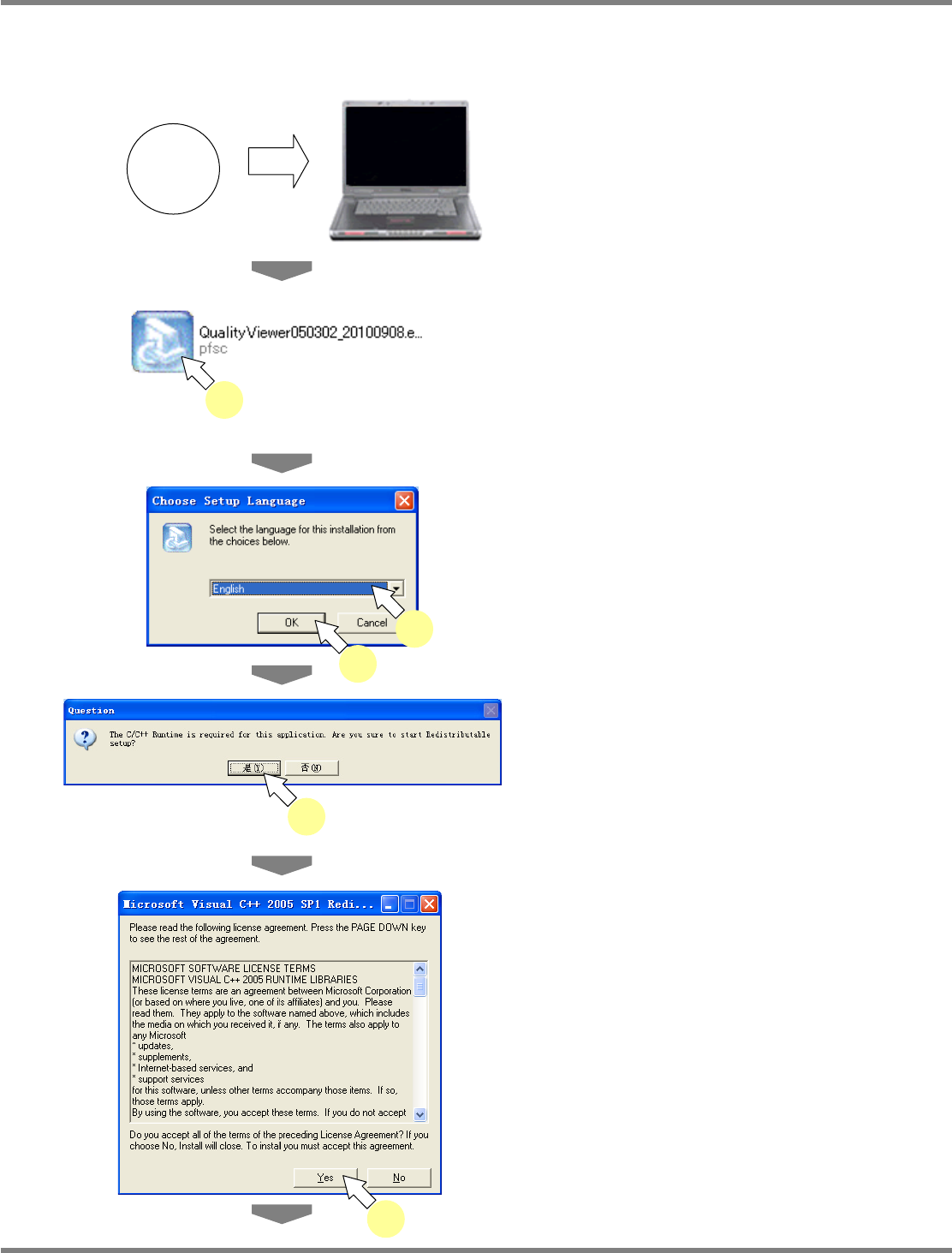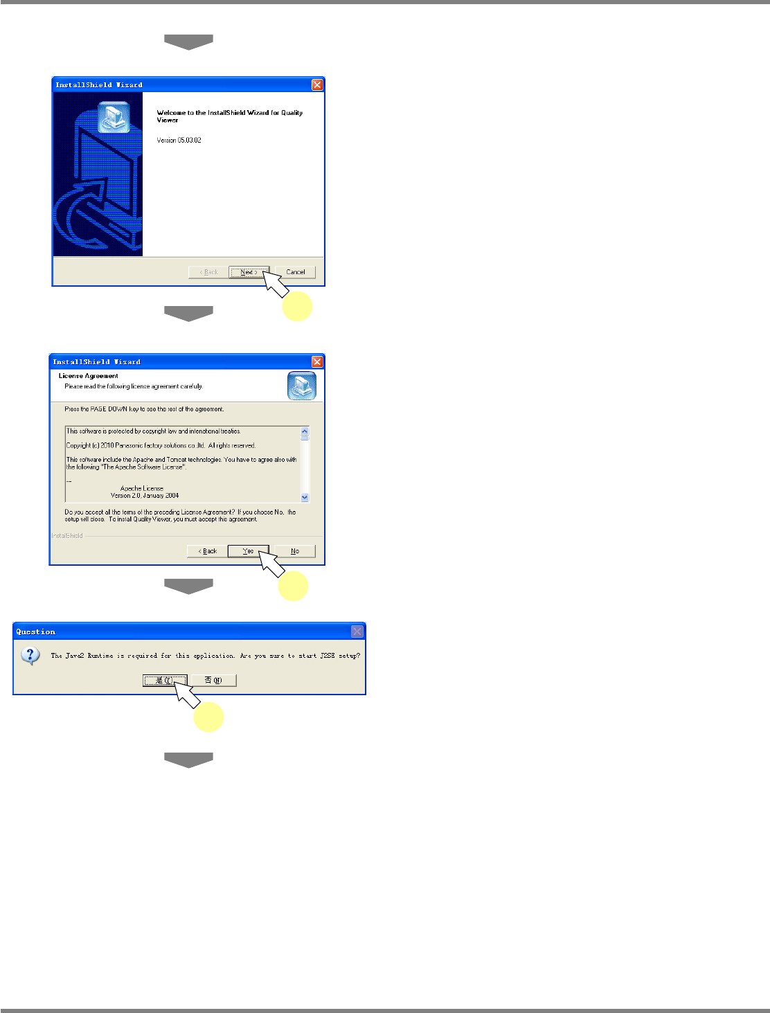NPM-D LNB 2.6 品质信息数据库的安装 Page 2-50 EJM1DC-MB-02L-00 • 完成了 C 运行程序的安装后,将会显示 品质信 息查看器的安装画面。 6 点击 [Next] 。 • 将显示许可证使用承诺画面。 7 确认内容后,点击 [Yes] 。 • 如果 PC 内没有安装 JAVA2 Runtime ,将会显 示 JAVA2 Runtime 的安装确认画面。 8 点击 [ 是 ] 。 • 将显示许可证使用承…