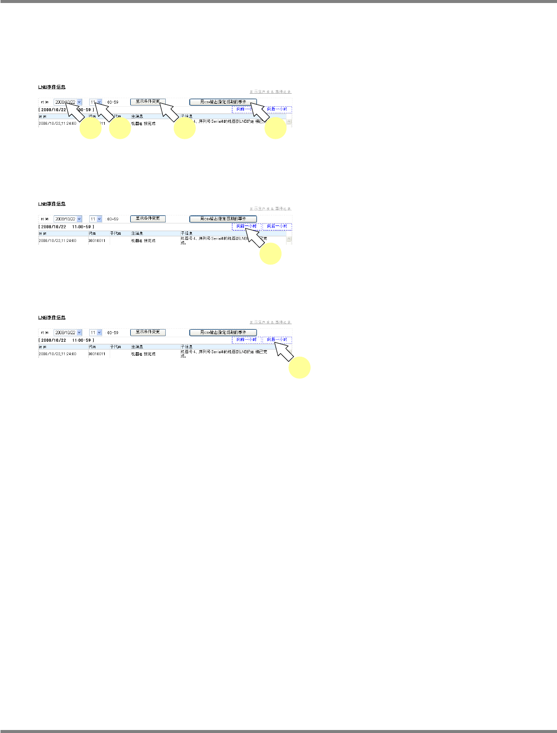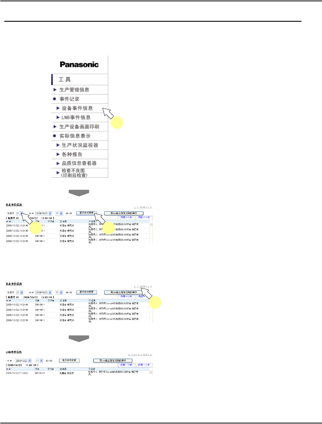 NPM-D LNB 3.2 事件信息 Page 3-14 EJM1DC-MB-03L-00 3.2 事件信息 3.2.1 设备事件信息 参阅设备事件信息。 1 在菜单中选择 [ 事件记录 ] 的 [ 设备事件 信息 ] 。 • 显示出设备事件信息。 2 在 “ 机器号 ” 组合框中选择显示事件信息 的机器号,然后按 [ 显示条件变更 ] 。 • 显示出指定机器的 1 小时内的设备事件信息。 显示事件信息的变更 1 选择 [ 显示 L…
