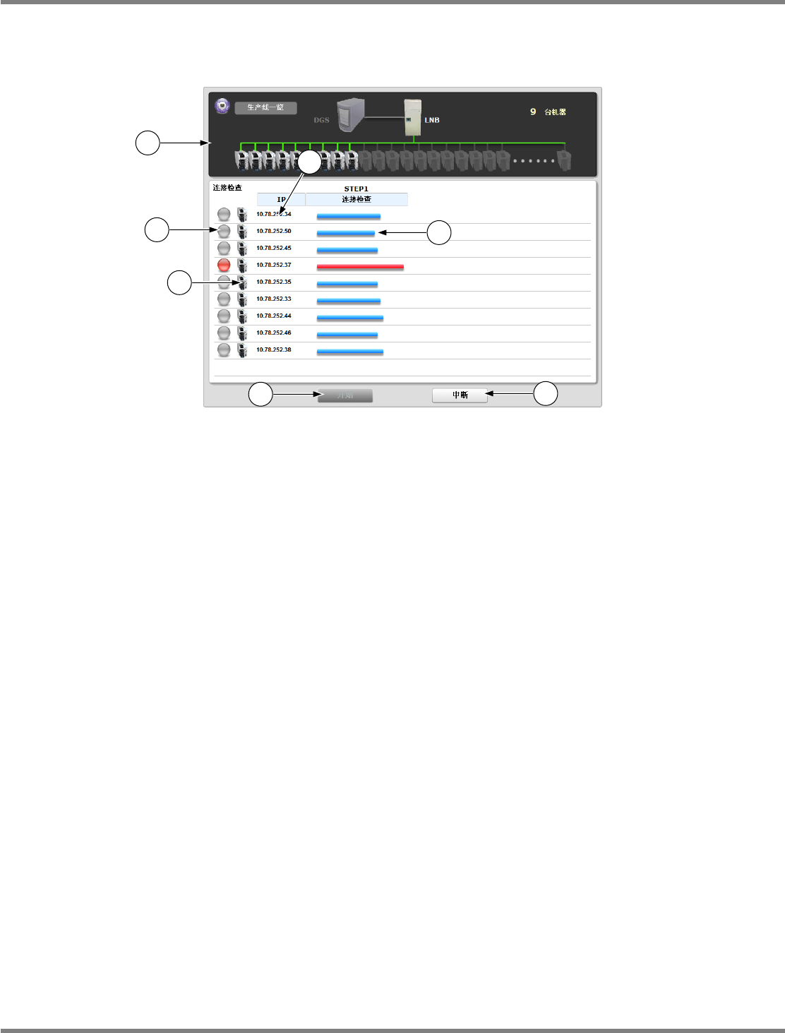 NPM-D LNB 4.9 自我诊断 Page 4-32 EJM1DC-MB-04L-00 4.9.1 连接检查 在连接检查中,验证 LNB 、设备、 DGS 的连接状态。 1 在菜单中选择 [ 自我诊断 ] 的 [ 连接检查 ] 。 • 显示出 < 连接检查 > 画面。 2 按 [ 开始 ] 。 • 执行连接检查。 • 显示出已获取 IP 地址的 DGS 、机器,在连接 检查的进度栏中显示进度状况。 • 连接检查完成。 •…