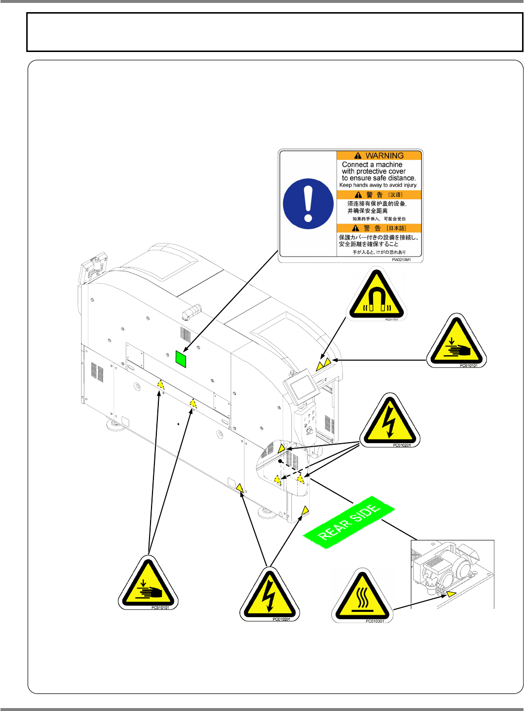 NPM-D 安全注意事项 EJM1DC-SF-02N-00 Page S-19 产品上的安全标牌 警告标牌 如下图所示,本机器贴有警告显示标 牌。请遵守标牌的指示。 标牌脱落时,请参照 Parts List ( 元件一览表 ) 的标牌型号,向本公司订购并 将其重新粘贴到正确的位置 。 后侧警告显示标牌粘贴位置 EJM9B-AF01