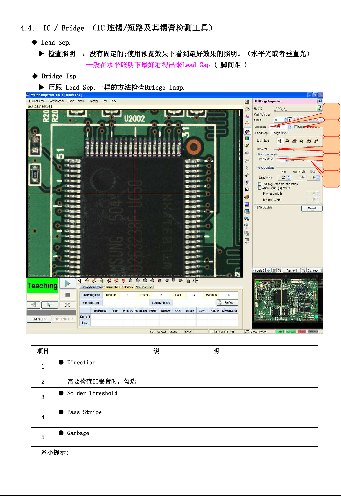 13 设置分脚 / 连锡时 , 选择好灯光类型后 , 把第 4 、 5(Pass Stripe/G arbage) 归零; 然后第 3 项 参数选择 Auto, 然后再选择 Manu le ;最后再设置 Garba ge 等参数。 为了找 Lead T ip( 脚前端 ) ,按 照 IC 引脚伸 出来方向设定方向 ● 通过调节数值大或小 ,使 的 IC 脚与脚之间相互分 离开。 ( 灰阶原理分脚 ) 调整 IC 宽度 ( 默认 0 ;特…